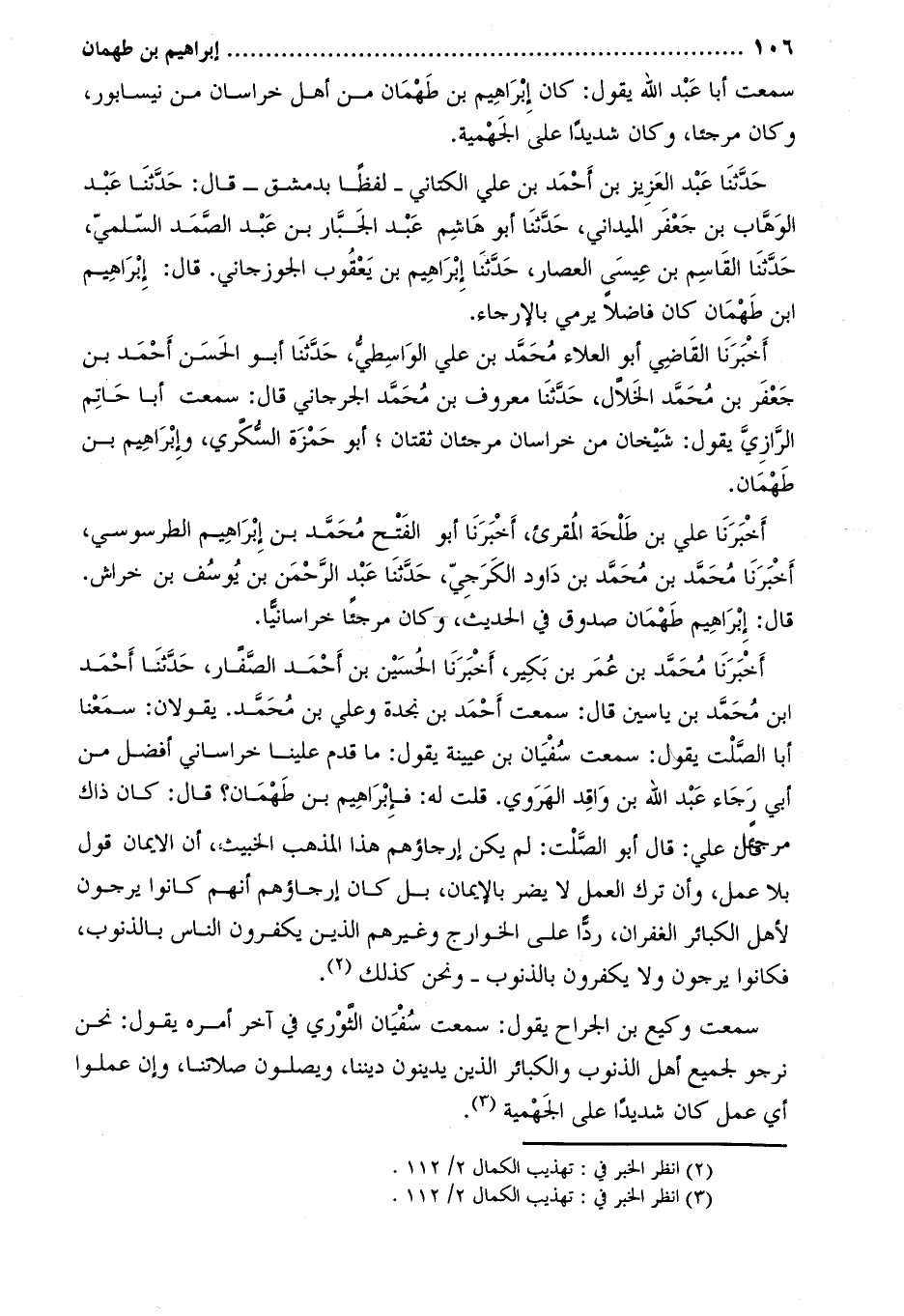 سمعت أبا عبد الله يقول: كان إبراهيم بن طهمان من أهل خراسان من نيسابور، وكان مرجئا، وكان شديدا على الجهمية.