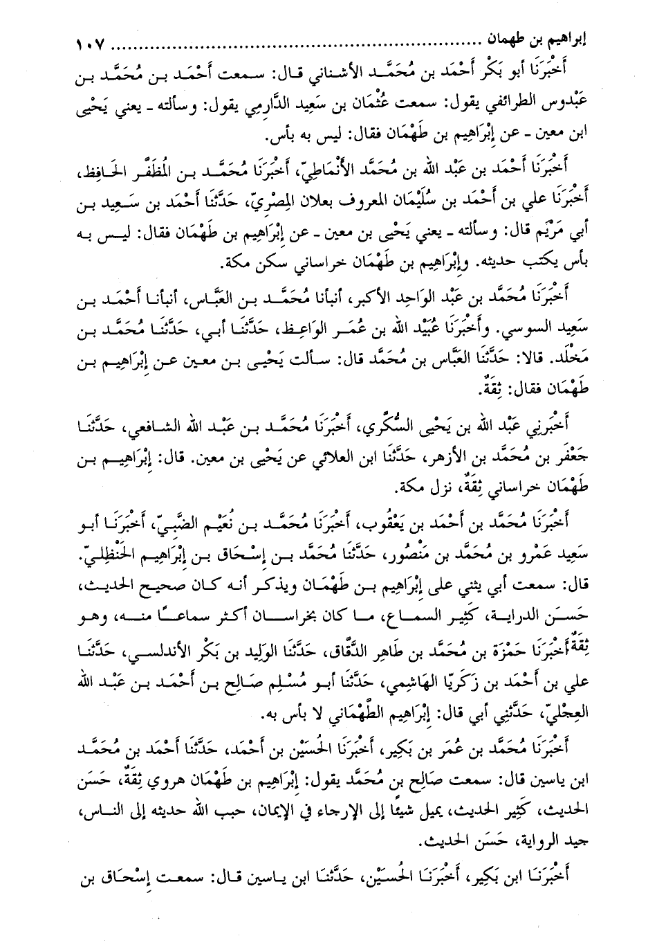 قَالَ: سمعت أبي يثني على إبراهيم بن طهمان ويذكر أنه كان صحيح الحديث، حسن الدراية، كثير السماع، ما كان بخراسان أكثر سماعا منه، وهو ثقة أَخْبَرَنَا حمزة بن محمد بن طاهر الدقاق، حدّثنا الوليد بن بكر الأندلسي، حدثنا علي بن أحمد بن زكريا الهاشمي، حدثنا أبو مسلم صالح بن أحمد بن عبد الله العجليّ، حَدَّثَنِي أبي قَالَ: إبراهيم الطهماني لا بأس بِهِ.