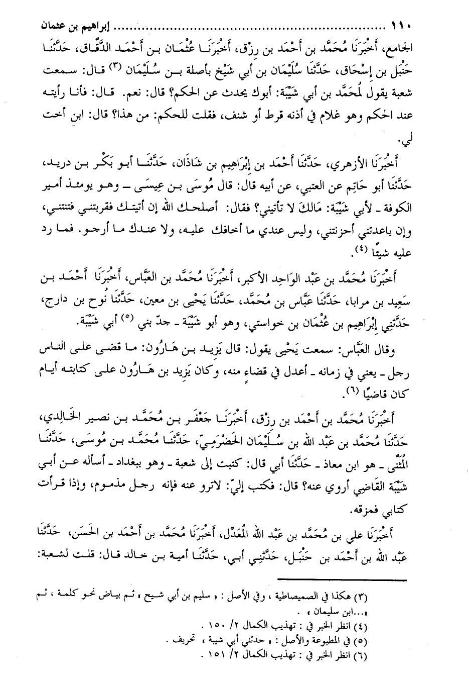 الجامع، أَخْبَرَنَا محمد بن أحمد بن رزق، أخبرنا عثمان بن أحمد الدّقّاق، حدّثنا حنبل بن إسحاق، حدّثنا سليمان بن أبي شيخ بأصلة بن سليمان [1] قَالَ: سمعت شعبة يقول لمحمد بن أبي شيبة: أبوك يحدث عن الحكم؟ قَالَ: نعم. قَالَ: فأنا رأيته عند الحكم وهو غلام في أذنه قرط أو شنف، فقلت للحكم: من هذا؟ قَالَ: ابن أخت لي.