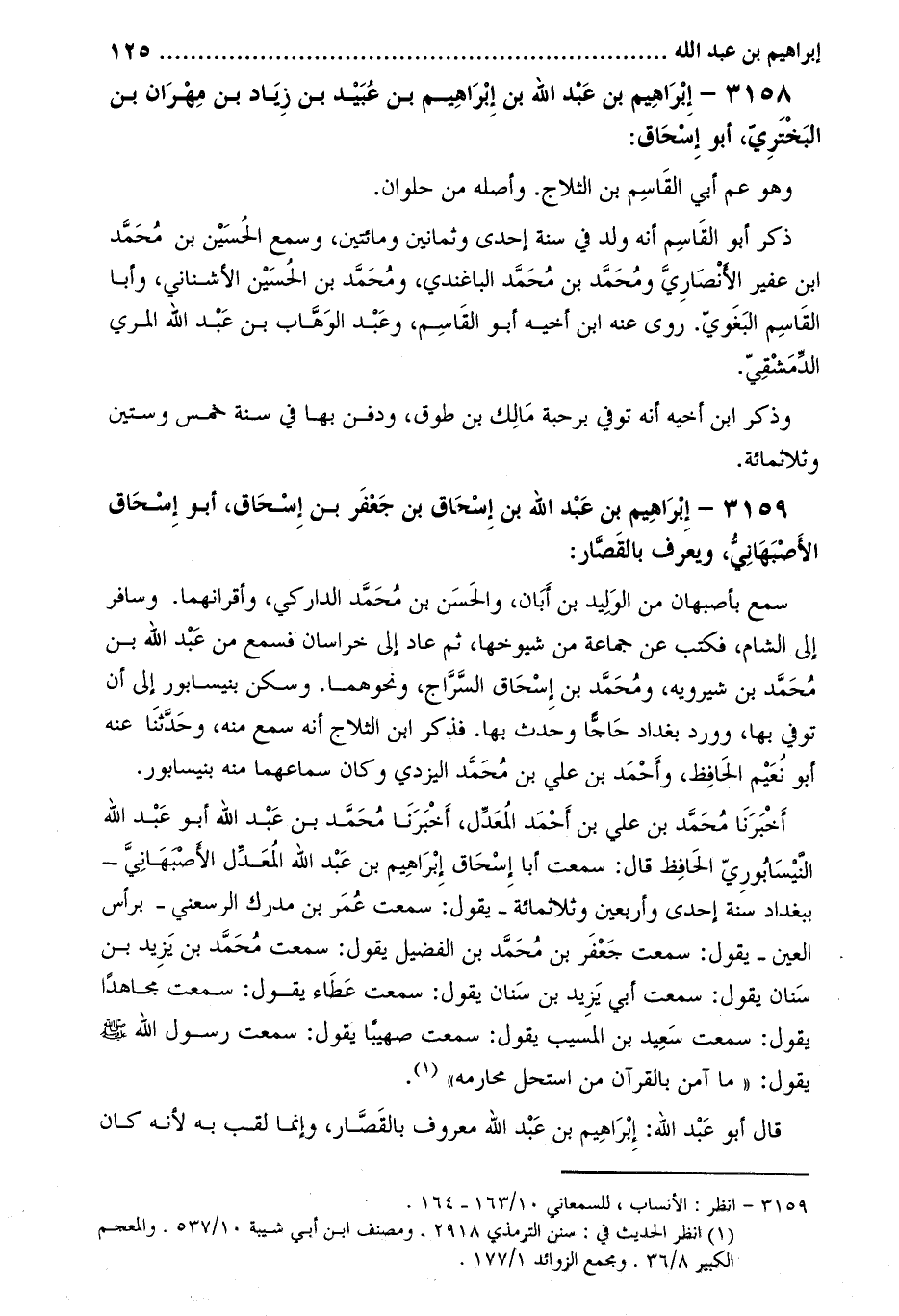 3159- إبراهيم بن عبد الله بن إسحاق بن جعفر بن إسحاق، أبو إسحاق الأصبهاني، ويعرف بالقصار [1] :
