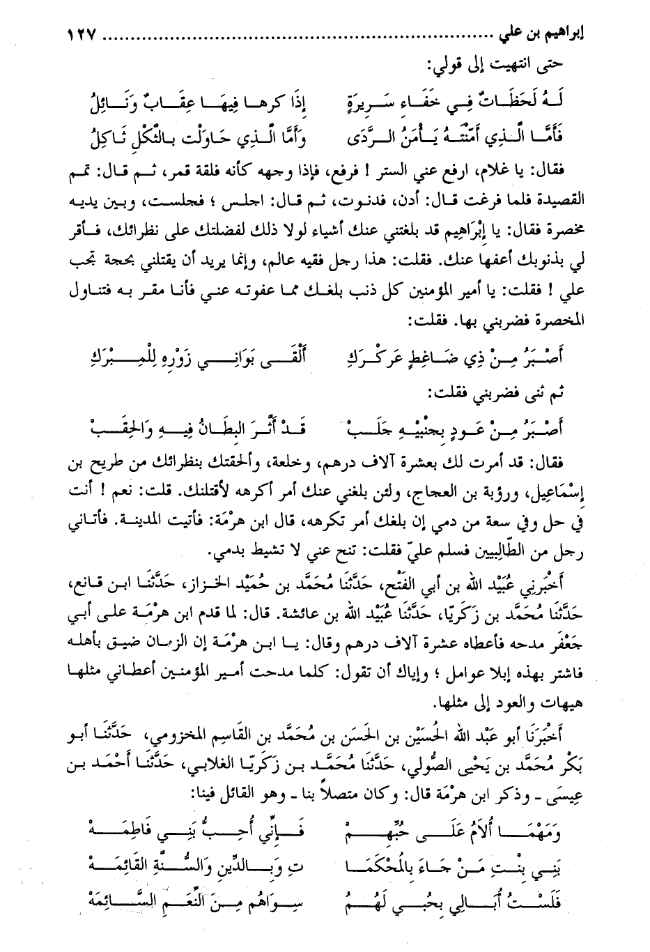 فقال: يا غلام، ارفع عني الستر! فرفع، فإذا وجهه كأنه فلقة قمر، ثم قَالَ: تمم القصيدة فلما فرغت قَالَ: ادن، فدنوت، ثم قَالَ: اجلس؛ فجلست، وبين يديه مخصرة فقال: يا إبراهيم قد بلغتني عنك أشياء لولا ذلك لفضلتك على نظرائك، فأقر لي بذنوبك أعفها عنك. فقلت: هذا رجل فقيه عالم، وإنما يريد أن يقتلني بحجة تجب علي! فقلت: يا أمير المؤمنين كل ذنب بلغك مما عفوته عني فأنا مقر به فتناول المخصرة فضربني بها. فقلت: