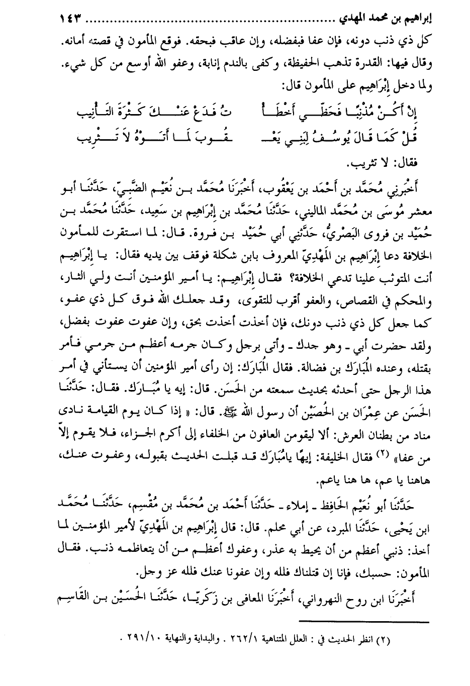 أخبرني محمّد بن أحمد بن يعقوب، أخبرنا محمّد بن نعيم الضّبيّ، حَدَّثَنَا أَبُو مَعْشَرٍ مُوسَى بْنُ مُحَمَّدٍ الْمَالِينِيُّ، حدّثنا محمّد بن إبراهيم بن سعيد، حدّثنا محمّد بن حميد بن فروى البصريّ، حَدَّثَنِي أَبِي حُمَيْدِ بْنِ فَرْوَةَ. قَالَ: لَمَّا اسْتَقَرَّتْ لِلْمَأْمُونِ الْخِلافَةُ دَعَا إِبْرَاهِيمَ بْنَ الْمَهْدِيِّ الْمَعْرُوفُ بِابْنِ شِكْلَةَ فَوَقَفَ بَيْنَ يَدَيْهِ فَقَالَ: يَا إِبْرَاهِيمُ أَنْتَ الْمُتَوَثِّبُ عَلَيْنَا تَدَّعِي الْخَلافَةَ؟ فَقَالَ إِبْرَاهِيمُ: يَا أَمِيرَ الْمُؤْمِنِينَ أَنْتَ وَلِيُّ الثَّارِ، وَالْمُحَكَّمُ فِي الْقَصَاصِ، وَالْعَفْوُ أَقْرَبُ لِلتَّقْوَى، وقد جعلك الله فوق كل ذي عفو، كما جعل كل ذِي ذَنْبٍ دُونَكَ، فَإِنْ أَخَذْتَ أَخَذْتَ بِحَقٍّ، وَإِنْ عَفَوْتَ عَفَوْتَ بِفَضْلٍ، وَلَقَدْ حَضَرْتَ أَبِي- وَهُوَ جَدُّكَ- وَأُتِيَ بِرَجُلٍ وَكَانَ جُرْمُهُ أَعْظَمُ مِنْ جُرْمِي فَأَمَرَ بِقَتْلِهِ، وَعِنْدَهُ الْمُبَارَكُ بْنُ فَضَالَةَ. فَقَالَ الْمُبَارَكُ: إِنْ رَأَى أَمِيرُ الْمُؤْمِنِينَ أَنْ يَسْتَأَنِي فِي أَمْرِ هَذَا الرَّجُلِ حَتَّى أُحَدِّثُهُ بِحَدِيثٍ سَمِعْتُهُ مِنَ الْحَسَنِ. قَالَ: إِيهٍ يَا مُبَارَكُ. فَقَالَ: حَدَّثَنَا الْحَسَنُ عَنْ عِمْرَانَ بْنِ الْحُصَيْنِ أَنَّ رَسُولَ اللَّهِ صَلَّى اللَّهُ عَلَيْهِ وَسَلَّمَ. قَالَ: «إِذَا كَانَ يَوْمُ الْقِيَامَةِ نَادَى مُنَادٍ مِنْ بُطْنَانِ الْعَرْشِ: ألا لَيَقُومَنَّ الْعَافُونَ مِنَ الْخُلَفَاءِ إِلَى أَكْرَمِ الْجَزَاءِ، فَلا يَقُومُ إِلا مَنْ عَفَا» [1]
