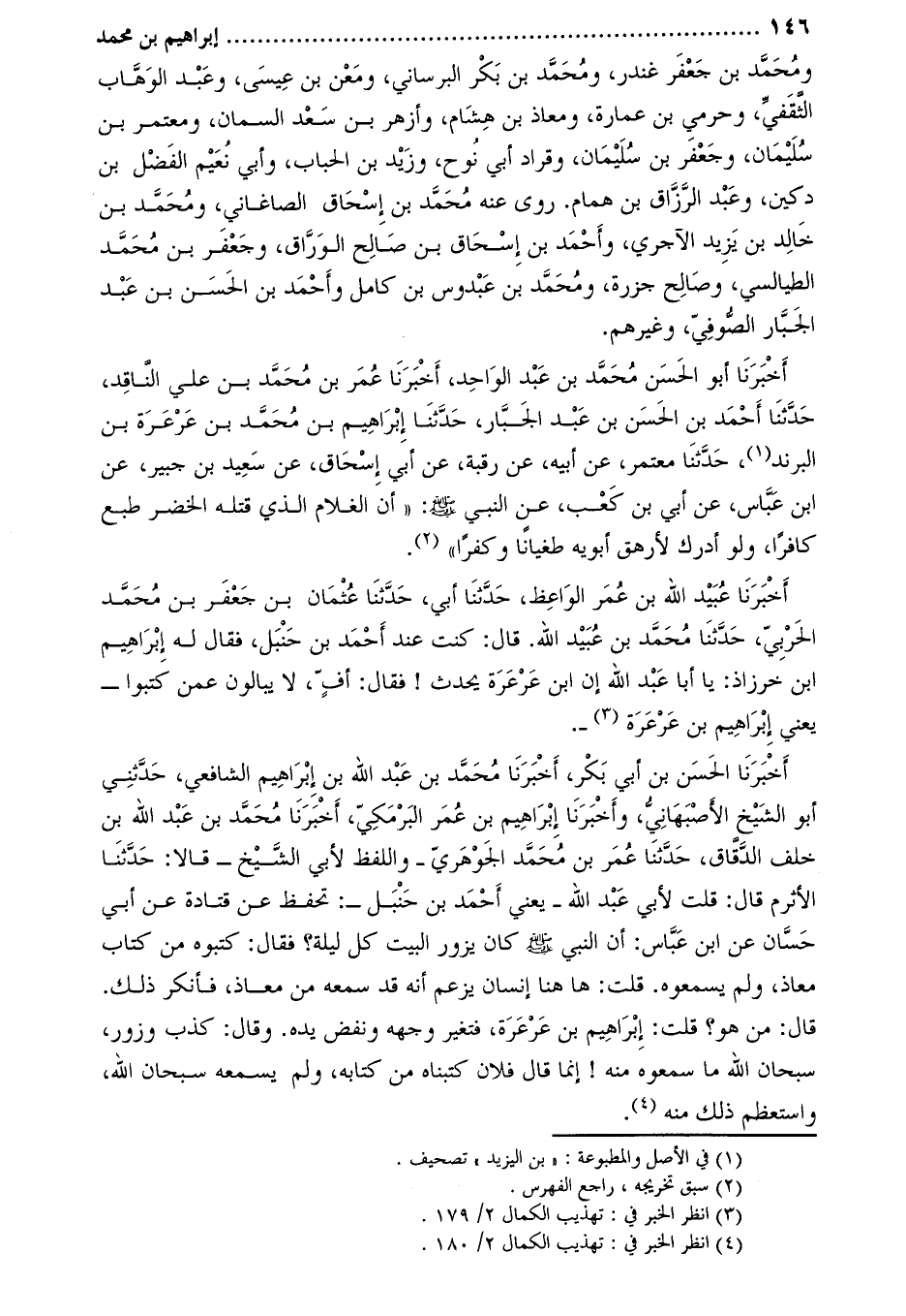 . أخبرنا عبيد الله بن عمر الواعظ، حدّثنا أبي، حدثنا عثمان بن جعفر بن محمد الحربي، حدثنا محمد بن عبيد الله. قال: كنت عند أحمد بن حنبل، فقال له إبراهيم ابن خرزاذ: يا أبا عبد الله إن ابن عرعرة يحدث! فقال: أف، لا يبالون عمن كتبوا- يعنى إبراهيم بن عرعرة [3]-.