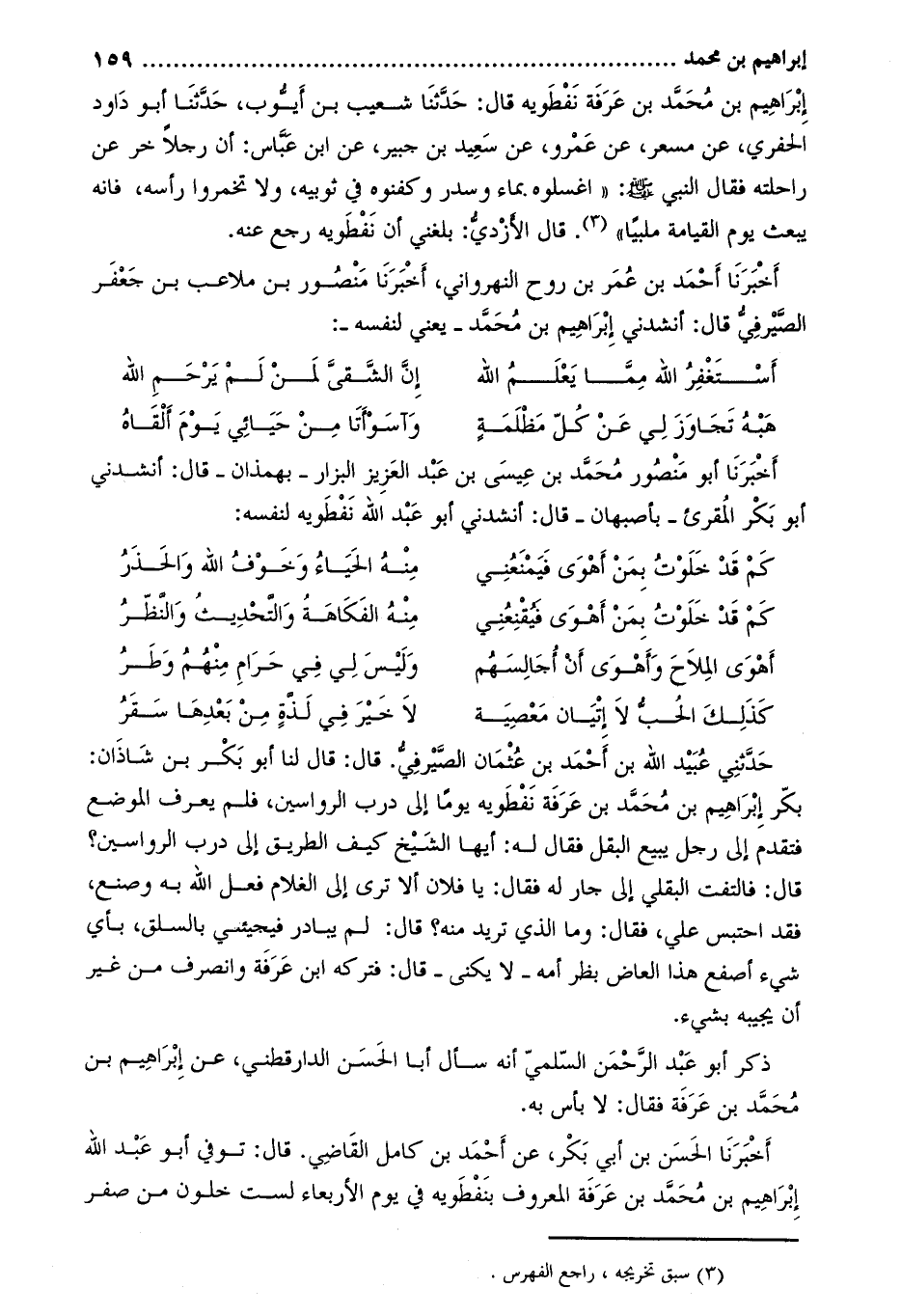 أخبرنا أحمد بن عمر بن روح النهرواني، أخبرنا منصور بن ملاعب بن جعفر الصيرفي قال: أنشدني إبراهيم بن محمّد- يعني لنفسه-: