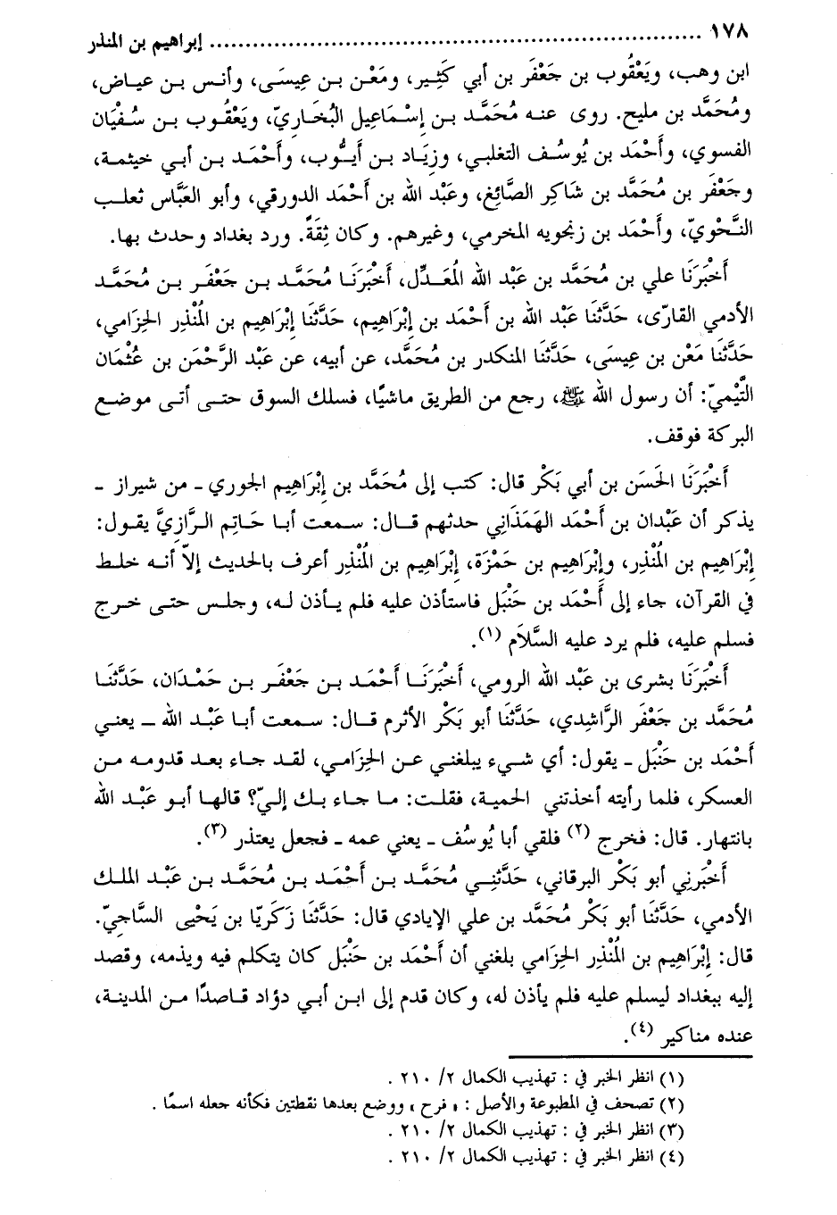 أخبرنا بشرى بن عبد الله الرومي، أخبرنا أحمد بن جعفر بن حمدان، حدّثنا محمّد بن جعفر الرّاشدي، حدثنا أَبُو بكر الأثرم قَالَ: سَمِعْت أَبَا عَبْدِ اللَّهِ- يعني أَحْمَدَ بْنَ حَنْبَلٍ- يَقُولُ: أي شيء يبلغني عن الحزامي، لقد جاء بعد قدومه من العسكر، فلما رأيته أخذتني الحمية، فقلت: ما جاء بك إليّ؟ قالها أبو عبد الله بانتهار. قال: فخرج [2] فلقي أبا يوسف- يعنى عمه- فجعل يعتذر [3] .