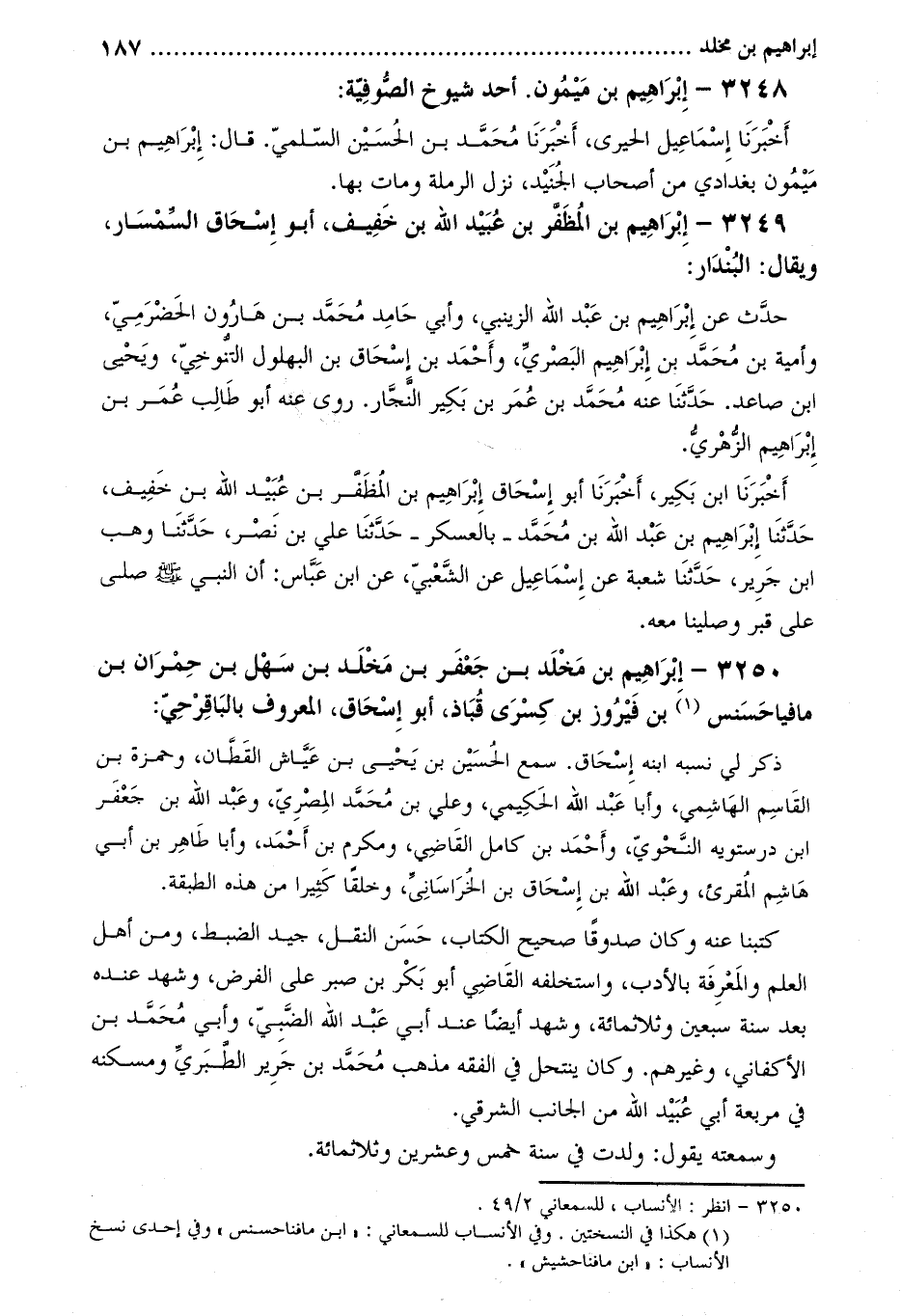3250-[1] إبراهيم بن مخلد بن جعفر بن مخلد بن سهل بن حمران بن مافيا حسنس [2] بن فيروز بن كسرى قُباذ، أبو إسحاق، المعروف بالباقرحي: