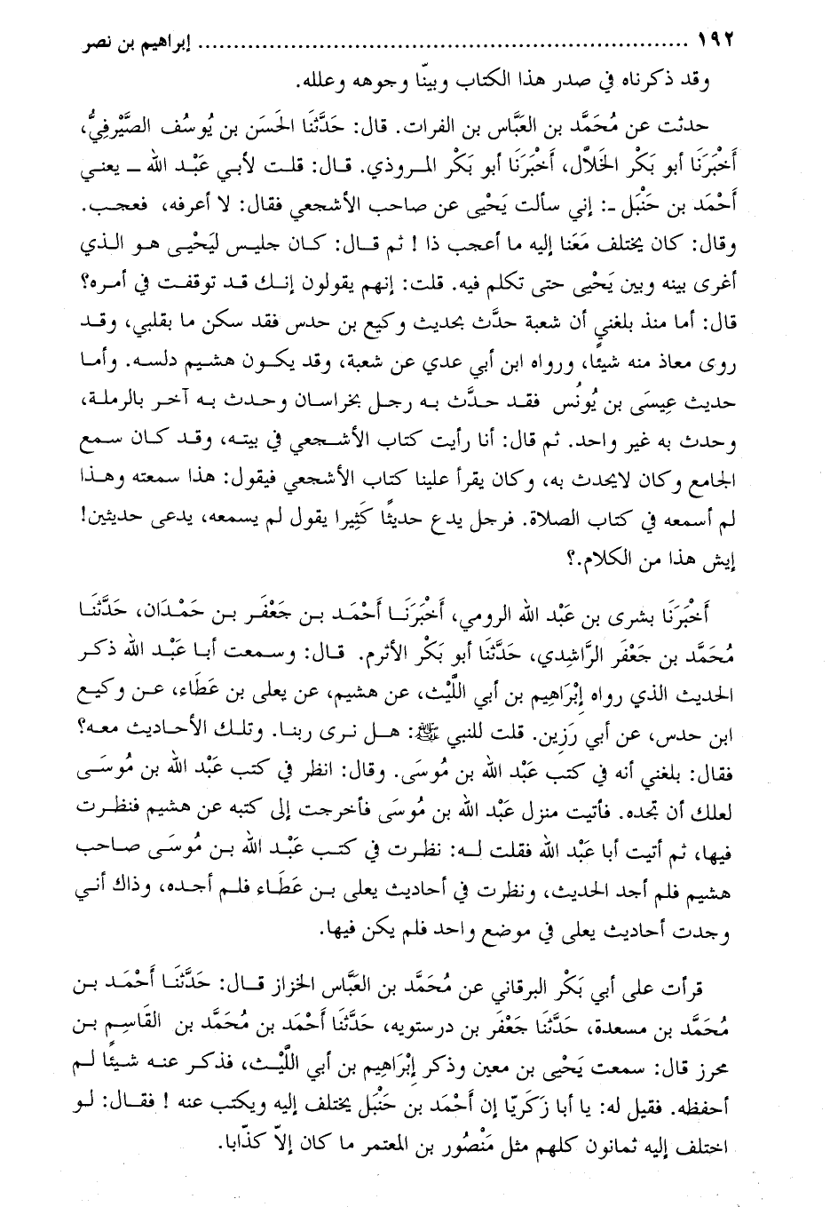 فقال: بلغني أنه في كتب عبد الله بن موسى. وقال: انظر في كتب عبد الله بن موسى لعلك أن تجده. فأتيت منزل عبد الله بن موسى فأُخْرِجت إليَّ كُتُبه عن هشيم فنظرت فيها، ثم أتيت أبا عبد الله فقلت له: نظرت في كتب عبد الله بن موسى صاحب هشيم فلم أجد الحديث، ونظرت في أحاديث يعلى بن عطاء فلم أجده، وذاك أني وجدت أحاديث يعلى في موضع واحد فلم يكن فيها.