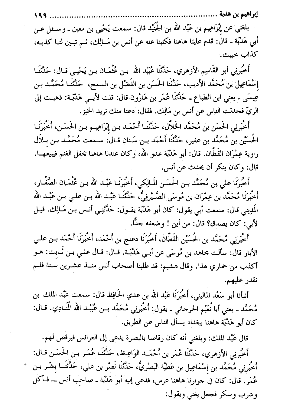 أخبرني أبو القاسم الأزهري، حَدَّثَنَا عبيد اللَّه بْن عثمان بْن يَحْيَى قَالَ: حدّثنا إسماعيل بن محمّد الأديب، حدّثنا الحسن بن الفضل بن السمح، حدثنا محمد بن عيسى- يعني ابن الطباع- حدثنا عمر بن هارون قال: قلت لأبي هدبة: ذهبت إلى الري فحدثت الناس عن أنس بن مالك. فقال: دعنا منك نريد الخبز.