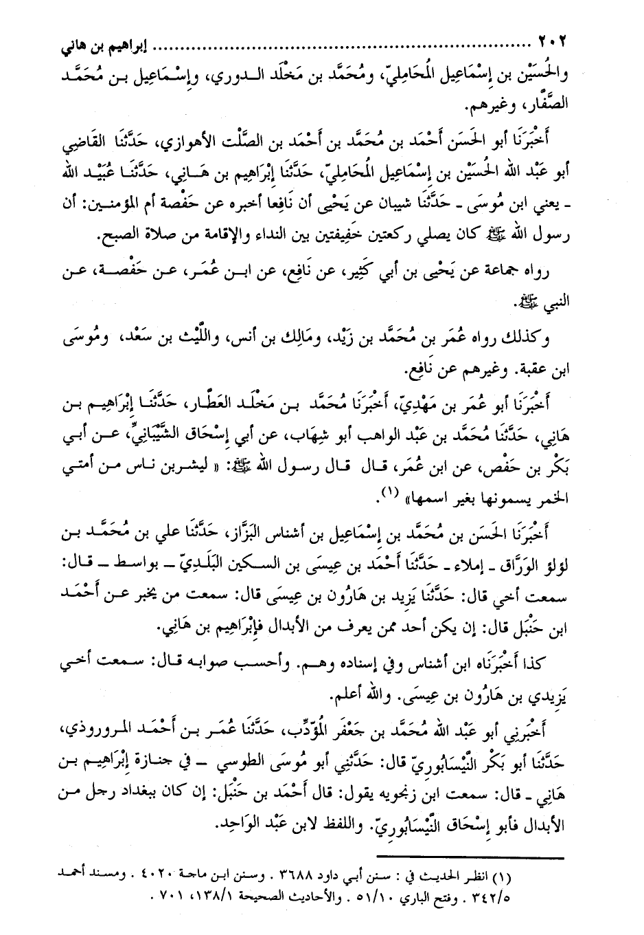 أَخْبَرَنَا أَبُو عُمَرَ بْنُ مَهْدِيٍّ، أخبرنا محمّد بن مخلد العطّار، حدّثنا إبراهيم بن هاني، حدّثنا محمّد بن عبد الواهب أَبُو شِهَابٍ، عَنْ أَبِي إِسْحَاقَ الشَّيْبَانِيِّ، عَنْ أَبِي بَكْرِ بْنِ حَفْصٍ، عَنِ ابْنِ عُمَرَ، قَالَ قَالَ رَسُولُ اللَّهِ صَلَّى اللَّهُ عَلَيْهِ وَسَلَّمَ: «لَيَشْرَبَنَّ نَاسٌ مِنْ أُمَّتِي الْخَمْرَ يُسَمُّونَهَا بِغَيْرِ اسْمِهَا» [1]