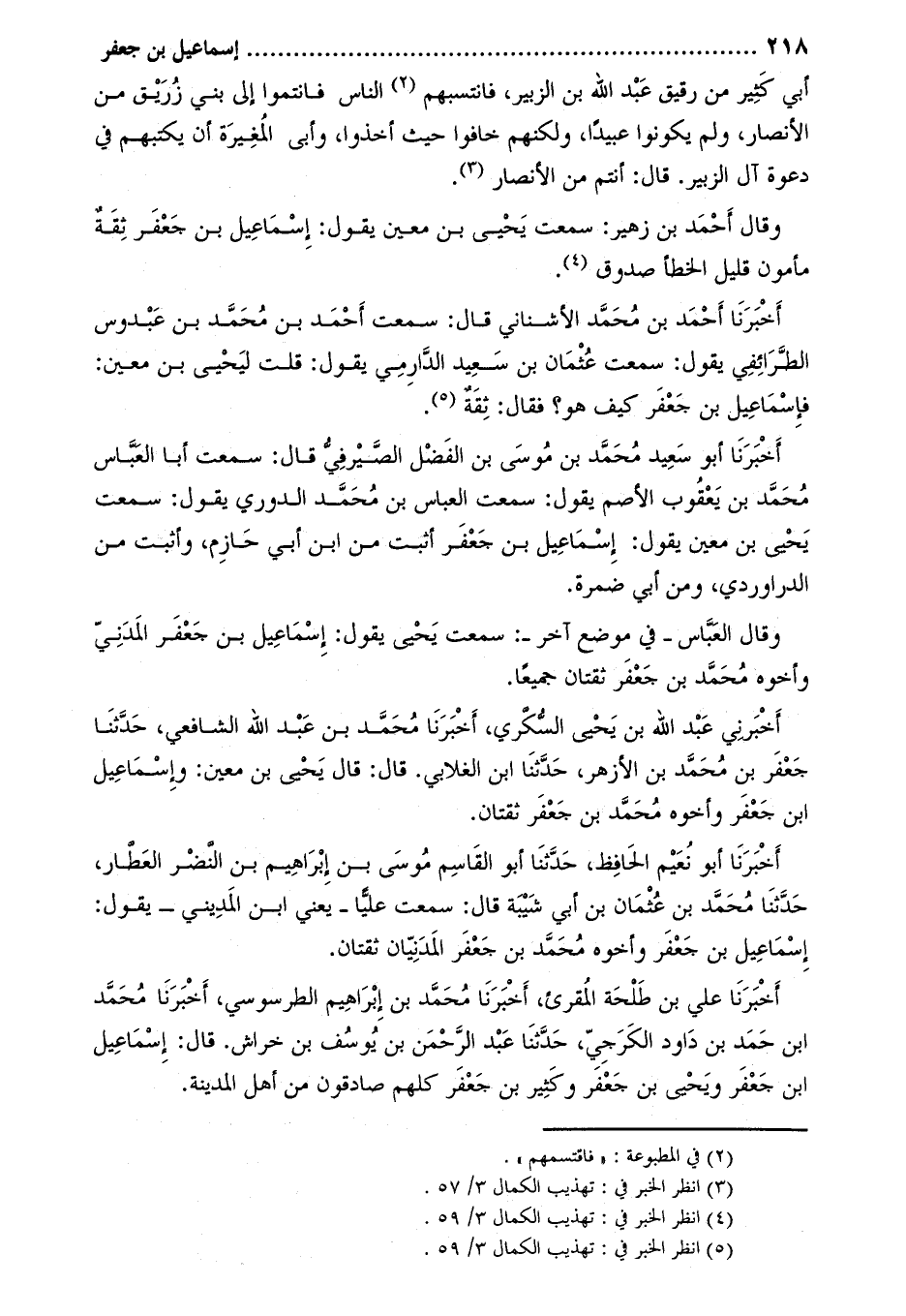 وَقَالَ أَحْمَد بن زهير: سَمِعْتُ يَحْيَى بن معين يقول: إسماعيل بن جعفر ثقة مأمون قليل الخطأ صدوق [3] .