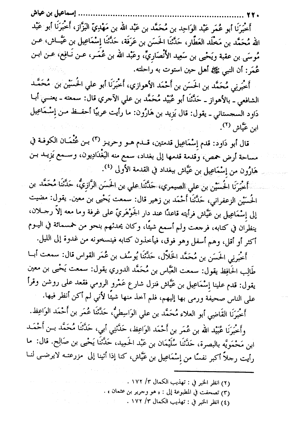 أخبرنا الحسين بن علي الصيمري، حدّثنا علي بن الحسن الرّازيّ، حدّثنا محمّد بن الحسين الزعفراني، حَدَّثَنَا أحمد بن زهير قَالَ: سمعت يحيى بن معين. يقول: مضيت إلى إسماعيل بن عياش فرأيته قاعدا عند دار الجوهري على غرفة وما معه إلّا رجلان، ينظران في كتابه، فرجعت ولم أسمع شيئا، وكان يحدثهم بنحو من خمسمائة في اليوم أكثر أو أقل، وهم أسفل وهو فوق، فيأخذون كتابه فينسخونه من غدوة إلى الليل.