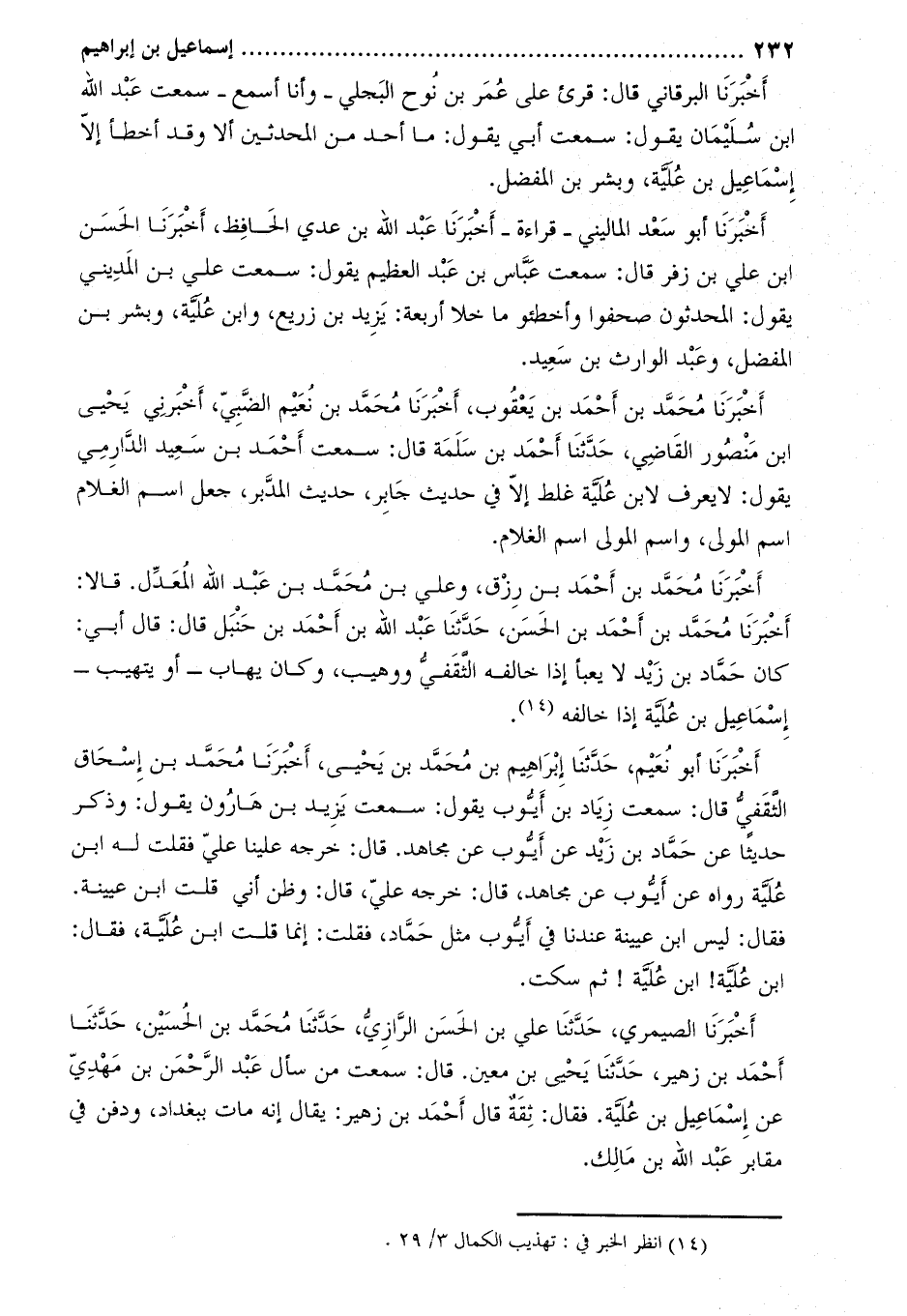 أخبرنا الصيمري، حدّثنا علي بن الحسن الرّازيّ، حدّثنا محمّد بن الحسين، حدّثنا أحمد بن زهير، حدثنا يحيى بن معين. قال: سمعت من سأل عبد الرحمن بن مهدي عن إسماعيل بن علية. فقال: ثقة قال أحمد بن زهير: يقال أنه مات ببغداد، ودفن فِي مقابر عَبْد الله بْن مالك.