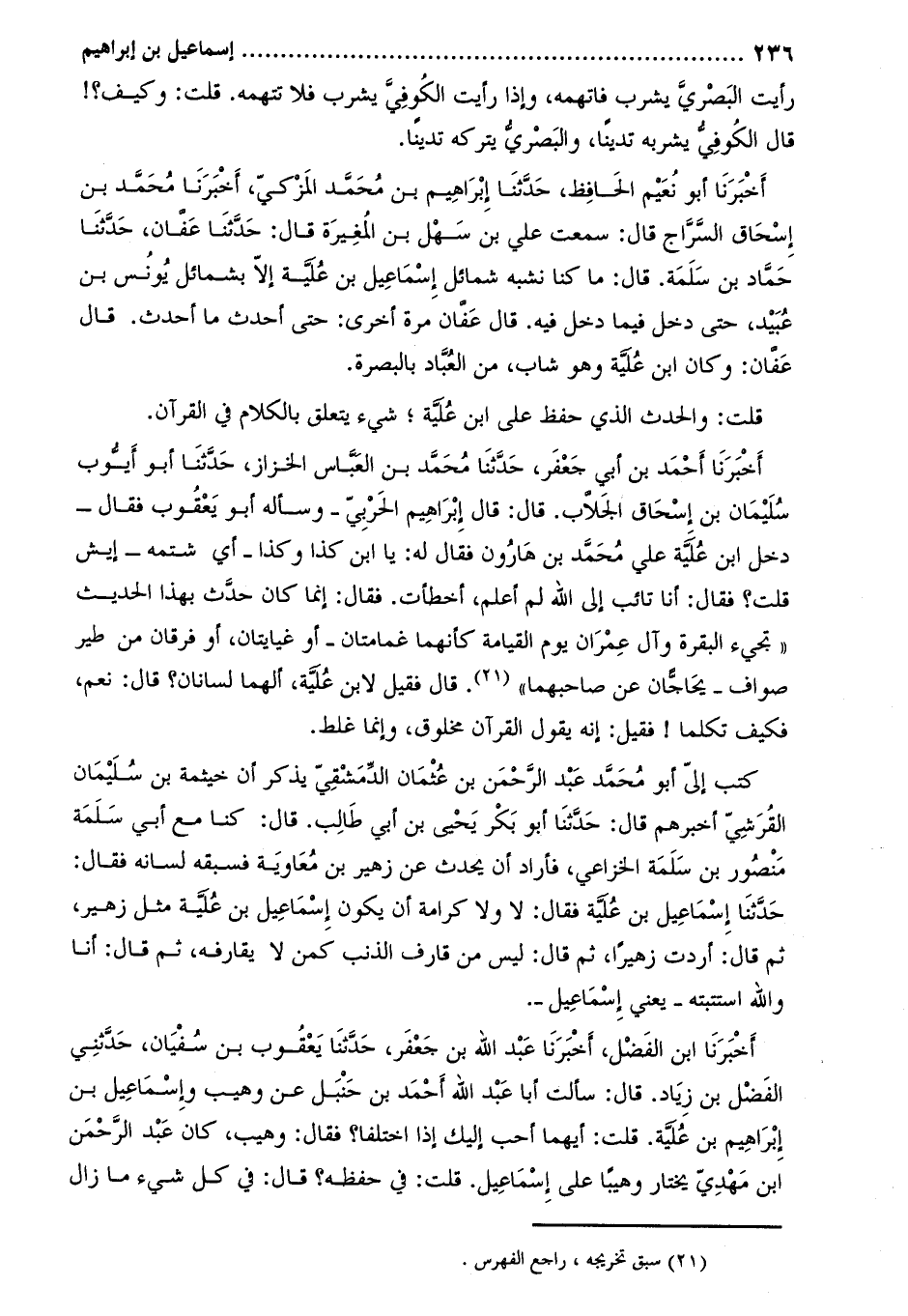 أخبرنا أحمد بن أبي جعفر، حدّثنا محمّد بن العبّاس الخزاز، حَدَّثَنَا أَبُو أَيُّوبَ سُلَيْمَانُ بْنُ إِسْحَاقَ الْجَلابُ. قَالَ: قال إبراهيم الحربي- وسأله أبو يعقوب فقال- دخل ابن علية على محمد بن هارون فقال له: يا ابن كذا وكذا- أي شتمه- إيش قلت؟ فقال: أنا تائب إلى الله لم أعلم، أخطأت. فقال: إنما كان حدث بهذا الحديث «تجيء البقرة وآل عمران يوم القيامة كأنهما غمامتان- أو غيايتان، أو فرقان من طير صواف- يحاجان عن صاحبهما» [1] . قال فقيل لابن علية، ألهما لسانان؟ قال: نعم، فكيف تكلما! فقيل: إنه يقول القرآن مخلوق، وإنما غلط.