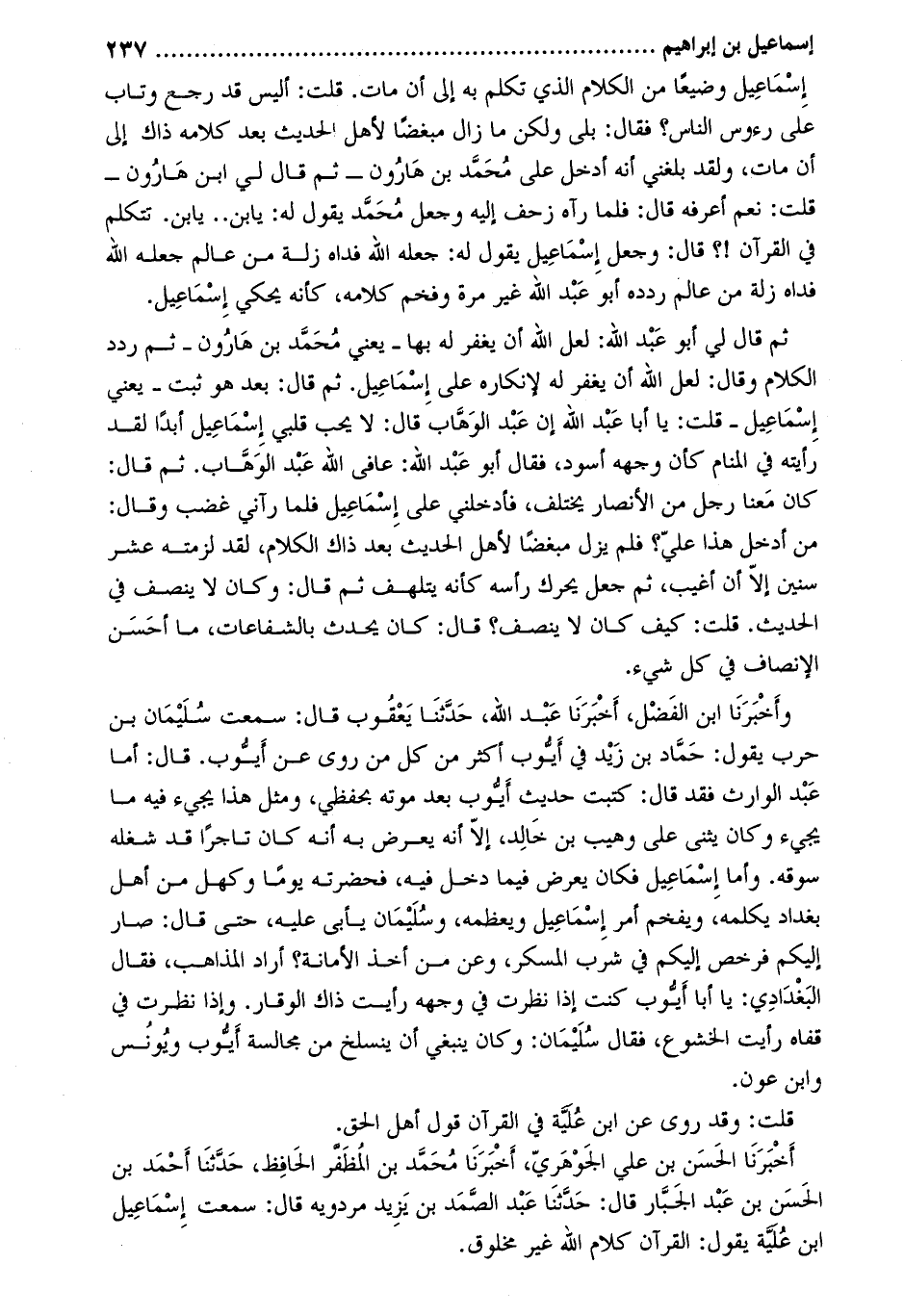 أخبرنا الحسن بن علي الجوهري، أخبرنا محمّد بن المظفّر الحافظ، حَدَّثَنَا أَحْمَدُ بْنُ الْحَسَنِ بْنِ عَبْدِ الْجَبَّارِ قال: حَدَّثَنَا عبد الصمد بن يزيد مردويه قال: سمعت إسماعيل ابن علية يقول: القرآن كلام الله غير مخلوق.