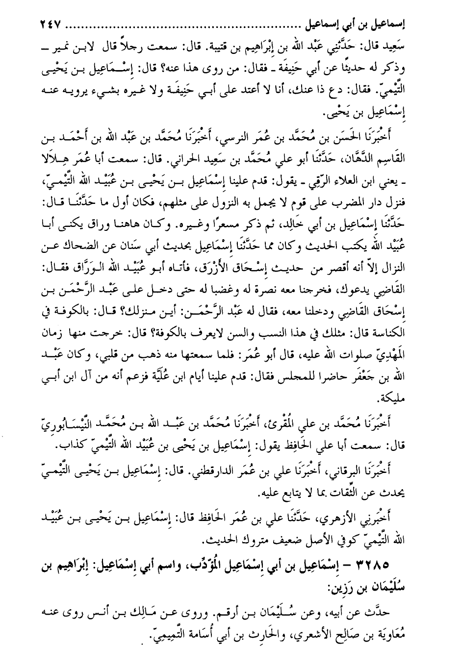 أخبرني الأزهري، حَدَّثَنَا علي بن عمر الحافظ قَالَ: إسماعيل بن يحيى بن عبيد الله التيمي كوفي الأصل ضعيف متروك الحديث.