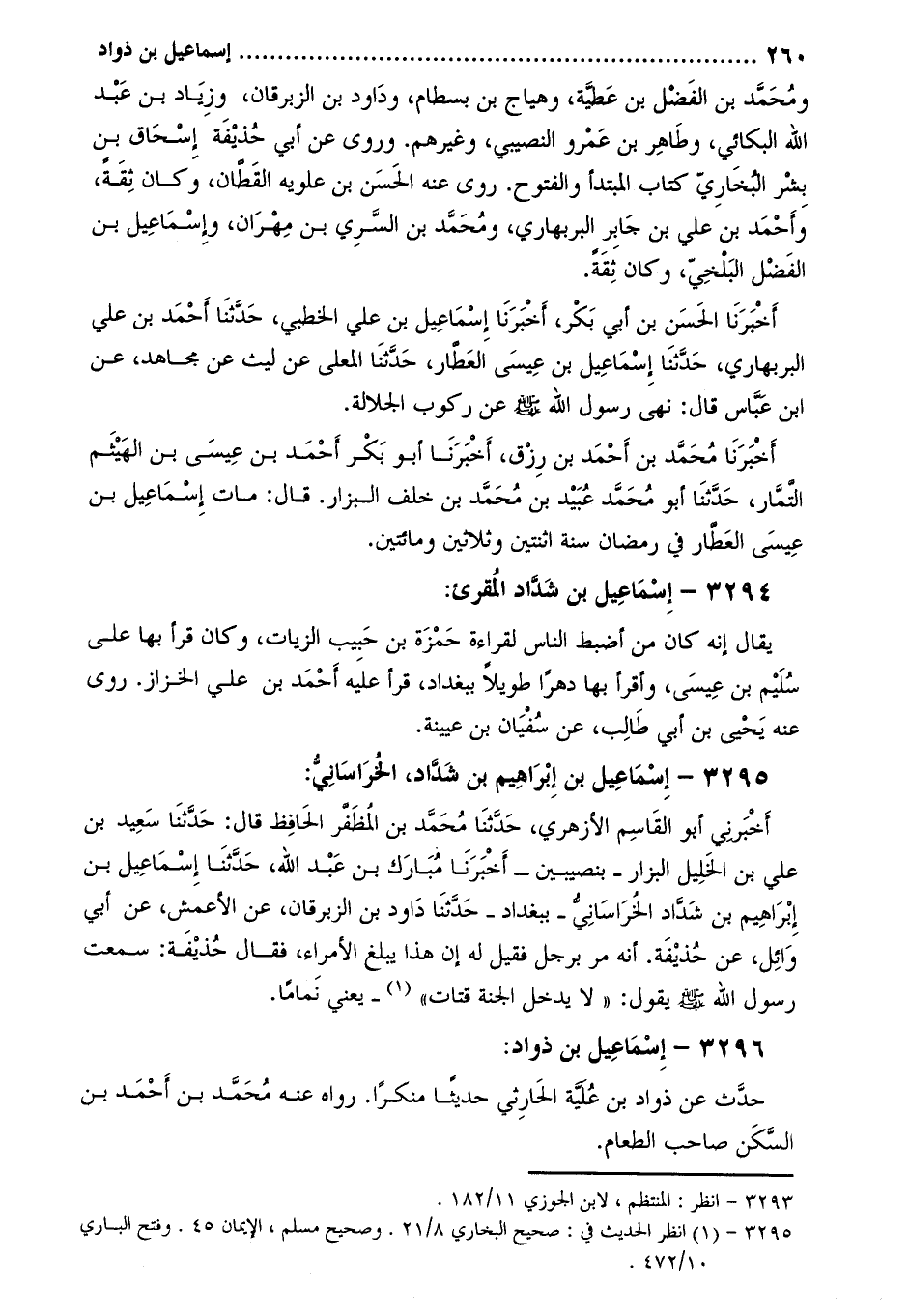 أَخْبَرَنِي أَبُو القاسم الأزهري، حَدَّثَنَا مُحَمَّدُ بْنُ الْمُظَفَّرِ الْحَافِظُ قَالَ: حَدَّثَنَا سعيد بن علي بن الخليل البزار- بنصيبين- أخبرنا مبارك بن عبد الله، حدّثنا إسماعيل بن إبراهيم بن شدّاد الخراسانيّ- ببغداد- حَدَّثَنَا دَاوُدُ بْنُ الزِّبْرِقَانِ، عَنِ الأَعْمَشِ، عَنْ أَبِي وَائِلٍ، عَنْ حُذَيْفَةَ. أَنَّهُ مَرَّ بِرَجُلٍ فَقِيلَ لَهُ إِنَّ هَذَا يُبَلِّغُ الأُمَرَاءَ، فَقَالَ حُذَيْفَةُ: سَمِعْتُ رَسُولَ اللَّهِ صَلَّى اللَّهُ عَلَيْهِ وَسَلَّمَ يَقُولُ: «لا يَدْخُلُ الْجَنَّةَ قَتَّاتٌ» [2]