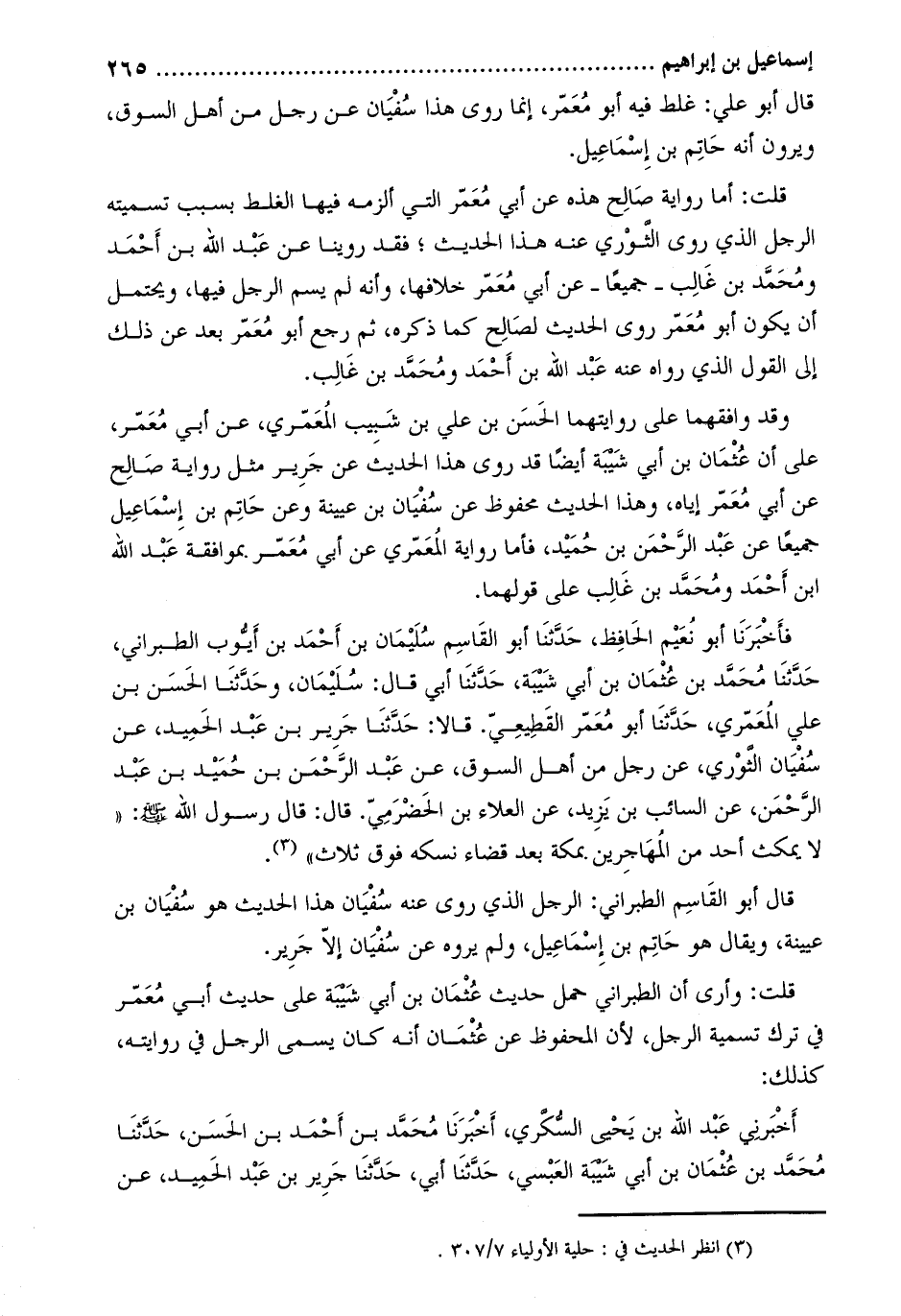 فَأَخْبَرَنَا أَبُو نُعَيْمٍ الحافظ، حَدَّثَنَا أَبُو الْقَاسِمِ سُلَيْمَانُ بْنُ أَحْمَدَ بْنِ أَيُّوبَ الطبراني، حدثنا محمد بن عثمان بن أبي شيبة، حَدَّثَنَا أَبِي قَالَ: سُلَيْمَانُ، وَحَدَّثَنَا الْحَسَنُ بْنُ علي المعمّري، حَدَّثَنَا أَبُو مَعْمَرٍ الْقَطِيعِيُّ. قَالا: حَدَّثَنَا جَرِيرُ بن عبد الحميد، عن سفيان الثوري، عن رَجُلٍ مِنْ أَهْلِ السُّوقِ، عَنْ عَبْدِ الرَّحْمَنِ بْنِ حُمَيْدِ بْنِ عَبْدِ الرَّحْمَنِ، عَنِ السَّائِبِ بْنِ يَزِيدَ، عَنِ الْعَلاءِ بْنِ الْحَضْرَمِيِّ. قَالَ: قَالَ رَسُولُ اللَّهِ صَلَّى اللَّهُ عَلَيْهِ وسلم: «لا يَمْكُثُ أَحَدٌ مِنَ الْمُهَاجِرِينَ بِمَكَّةَ بَعْدَ قَضَاءِ نُسُكِهِ فَوْقَ ثَلاثٍ» [1]