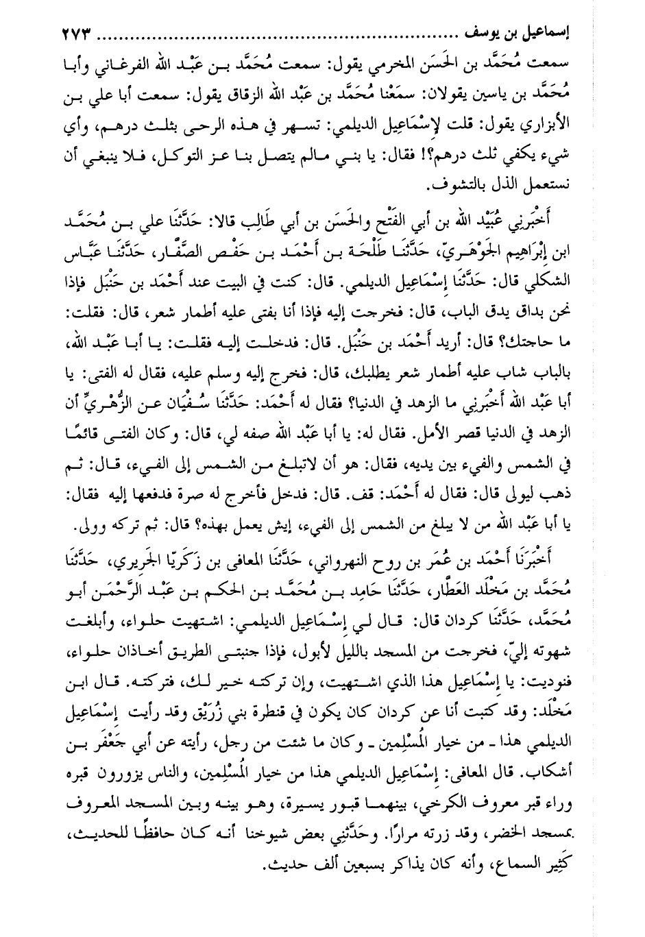 أخبرني عبيد الله بن أبي الفتح والحسن بن أبي طالب قالا: حدثنا علي بن محمّد ابن إبراهيم الجوهريّ، حدثنا طلحة بن أحمد بن حفص الصفار، حدثنا عباس الشكلي قال: حدثنا إسماعيل الديلمي. قال: كنت في البيت عند أحمد بن حنبل فإذا نحن بداق يدق الباب، قال: فخرجت إليه فإذا أنا بفتى عليه أطمار شعر، قال: فقلت: