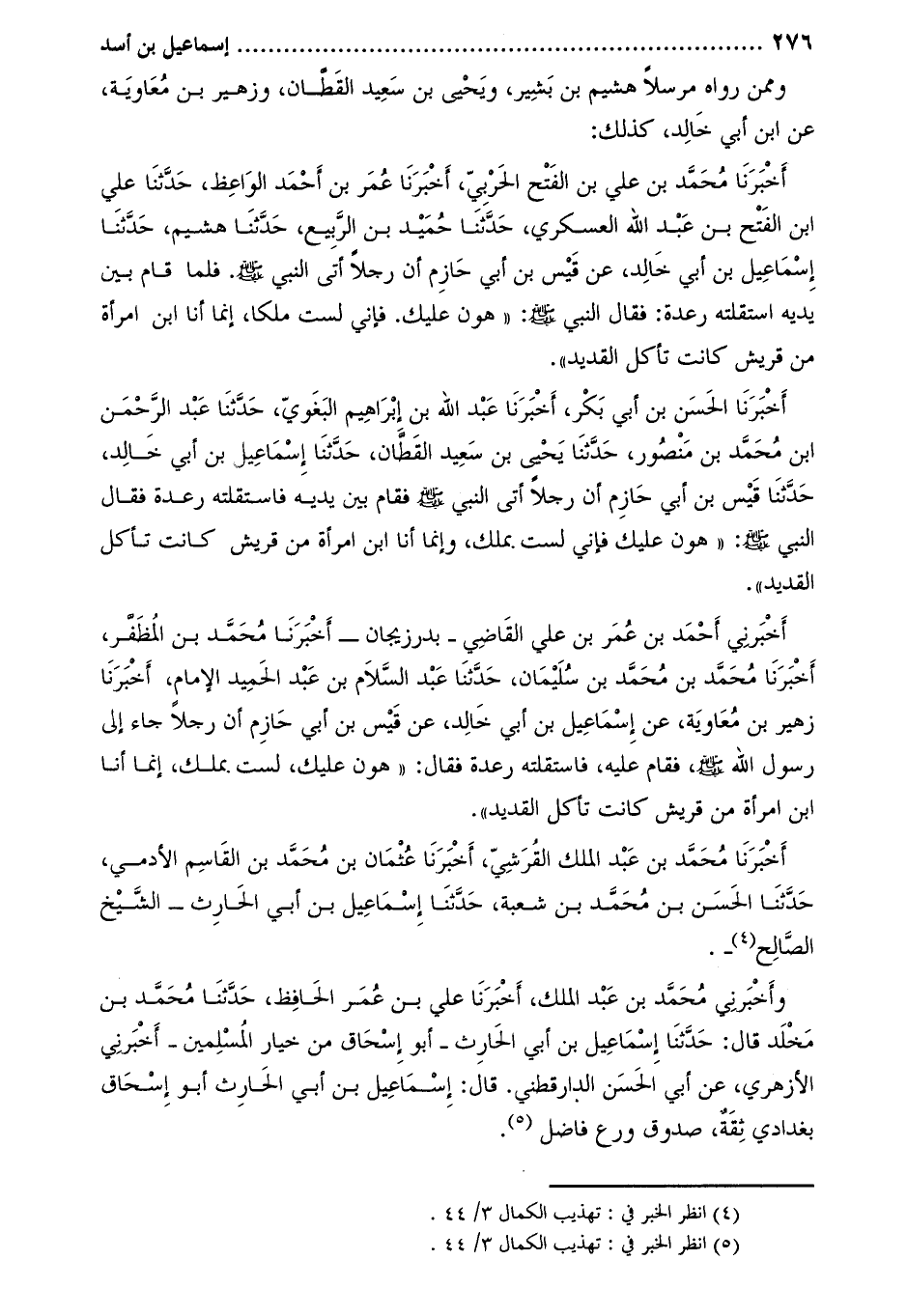 أَخْبَرَنَا مُحَمَّدُ بْنُ عَلِيِّ بْنِ الْفَتْحِ الْحَرْبِيُّ، أخبرنا عمر بن أحمد الواعظ، حدّثنا علي ابن الفتح بن عبد الله العسكري، حدّثنا حميد بن الرّبيع، حدّثنا هشيم، حَدَّثَنَا إِسْمَاعِيلَ بْنِ أَبِي خَالِدٍ، عَنْ قَيْسِ بْنِ أبي حازم أَنَّ رَجُلا أَتَى النَّبِيَّ صَلَّى اللَّهُ عَلَيْهِ وَسَلَّمَ. فَلَمَّا قَامَ بَيْنَ يَدَيْهِ اسْتَقَلَّتْهُ رَعْدَةٌ: فَقَالَ النَّبِيُّ صَلَّى اللَّهُ عَلَيْهِ وَسَلَّمَ: «هَوِّنْ عَلَيْكَ. فَإِنِّي لَسْتُ مَلِكًا، إِنَّمَا أَنَا ابْنُ امْرَأَةٍ مِنْ قُرَيْشٍ كَانَتْ تَأْكُلُ الْقَدِيدَ»