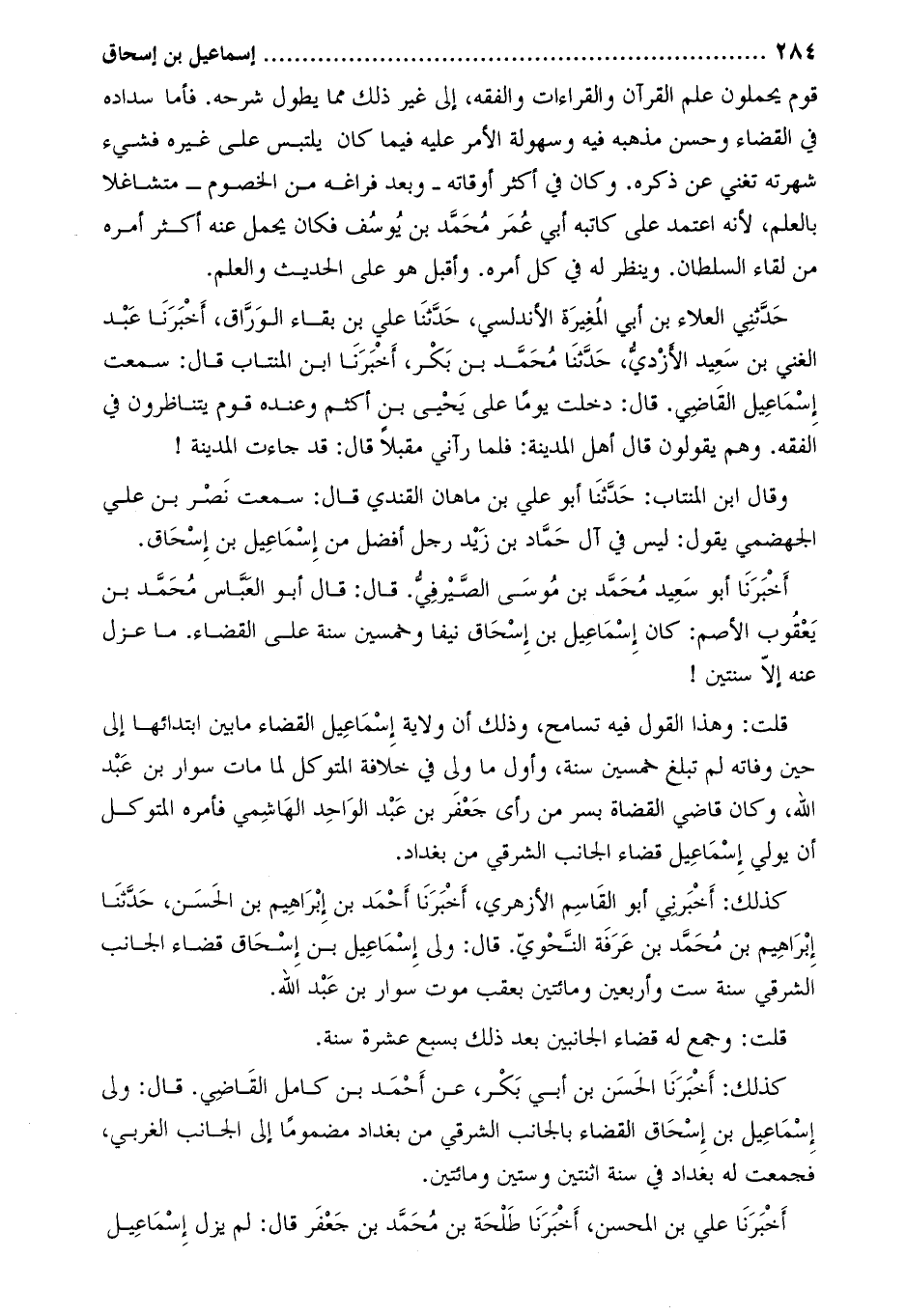 حَدَّثَنِي العلاء بْن أبي المغيرة الأندلسي، حدّثنا علي بن بقاء الورّاق، أخبرنا عبد الغني بن سعيد الأزديّ، حدّثنا محمّد بن بكر، أخبرنا ابن المنتاب قال: سمعت إسماعيل القاضي. قال: دخلت يوما على يحيى بن أكثم وعنده قوم يتناظرون في الفقه. وهم يقولون قال أهل المدينة: فلما رآني مقبلا قال: قد جاءت المدينة! وقال ابن المنتاب: حدثنا أبو علي بن ماهان القندي قال: سمعت نصر بن علي الجهضمي يقول: ليس في آل حماد بن زيد رجل أفضل من إسماعيل بن إسحاق.