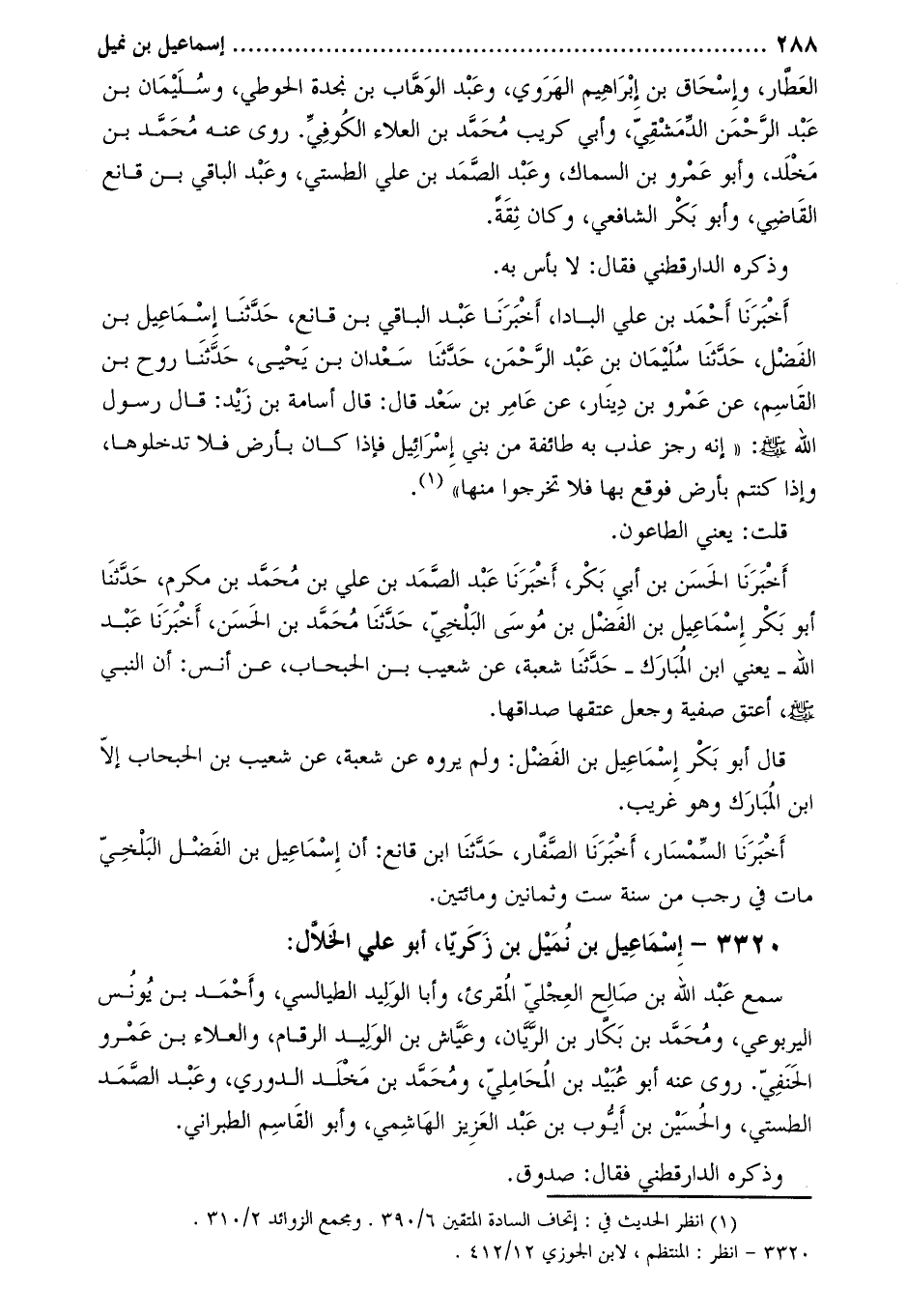 أَخْبَرَنَا أَحْمَد بْن علي البادا، أخبرنا عبد الباقي بن قانع، حدّثنا إسماعيل بن الفضل، حدّثنا سليمان بن عبد الرّحمن، حدّثنا سعدان بن يحيى، حَدَّثَنَا رَوْحُ بْنُ الْقَاسِمِ، عَنْ عَمْرِو بْنِ دِينَارٍ، عَنْ عَامِرِ بْنِ سَعْدٍ قَالَ: قَالَ أُسَامَةُ بْنُ زَيْدٍ: قَالَ رَسُولُ اللَّهِ صَلَّى اللَّهُ عَلَيْهِ وَسَلَّمَ: «إِنَّهُ رِجْزٌ عُذِّبَ بِهِ طَائِفَةٌ مِنْ بَنِي إِسْرَائِيلَ فَإِذَا كَانَ بِأَرْضٍ فَلا تَدْخُلُوهَا، وَإِذَا كُنْتُمْ بِأَرْضٍ فَوَقَعَ بِهَا فَلا تَخْرُجُوا مِنْهَا» [1]