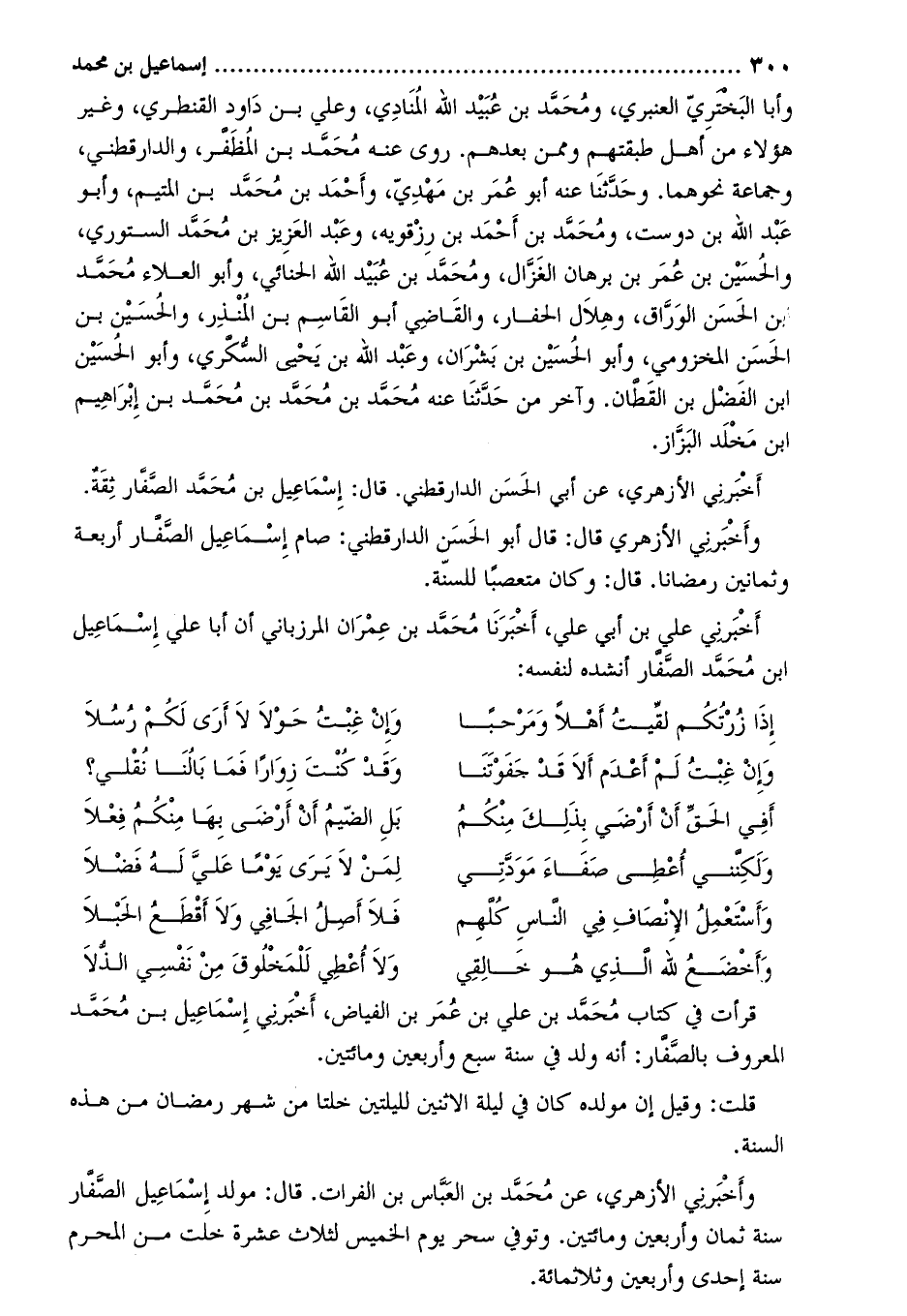 وأخبرني الأزهري قال: قال أبو الحسن الدارقطني: صام إسماعيل الصفار أربعة وثمانين رمضانا. قال: وكان متعصبا للسنة.