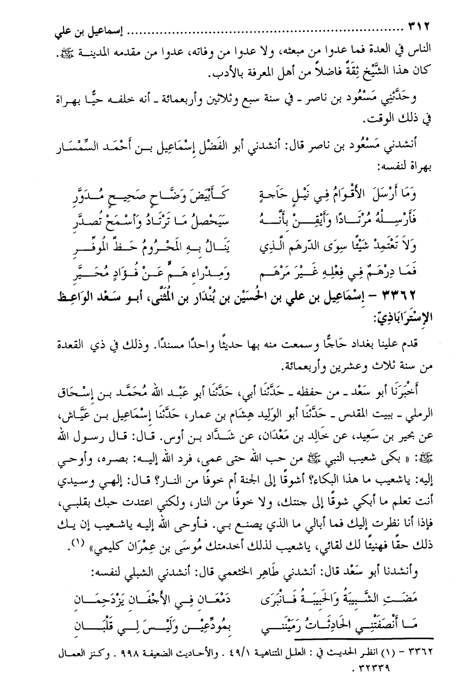 أخبرنا أبو سعد- من حفظه- حدّثنا أبي، حَدَّثَنَا أَبُو عَبْدِ اللَّهِ مُحَمَّدُ بْنُ إِسْحَاقَ الرملي- ببيت المقدس- حدّثنا أبو الوليد هشام بن عمار، حَدَّثَنَا إِسْمَاعِيلُ بْنُ عَيَّاشٍ، عَنْ بَحِيرِ بْنِ سعيد، عَنْ خَالِدِ بْنِ مَعْدَانَ، عَنْ شَدَّادِ بْنِ أَوْسٍ. قَالَ: قَالَ رَسُولُ اللَّهِ صَلَّى اللَّهُ عَلَيْهِ وَسَلَّمَ: «بَكَى شُعَيْبٌ النَّبِيُّ صَلَّى اللَّهُ عَلَيْهِ وَسَلَّمَ مِنْ حُبِّ اللَّهِ حَتَّى عَمِيَ، فَرَدَّ اللَّهُ إِلَيْهِ: بَصَرَهُ، وَأَوْحَى إِلَيْهِ: يَا شُعَيْبُ مَا هَذَا الْبُكَاءُ؟ أَشَوْقًا إِلَى الْجَنَّةِ أَمْ خَوْفًا مِنَ النَّارِ؟ قَالَ: إِلَهِي وَسَيِّدِي أَنْتَ تَعْلَمُ مَا أَبْكِي شَوْقًا إِلَى جَنَّتِكَ، ولا خوفا من النار، ولكني اعتدت حُبَّكَ بِقَلْبِي، فَإِذَا أَنَا نَظَرْتُ إِلَيْكَ فَمَا أُبَالِي مَا الَّذِي يُصْنَعُ بِي. فَأَوْحَى اللَّهُ إِلَيْهِ يَا شُعَيْبُ إِنْ يَكُ ذَلِكَ حَقًّا فَهَنِيئًا لَكَ لِقَائِي، يَا شُعَيْبُ لِذَلِكَ أَخْدَمْتُكَ مُوسَى بْنُ عِمْرَانَ كَلِيمِي» [1]