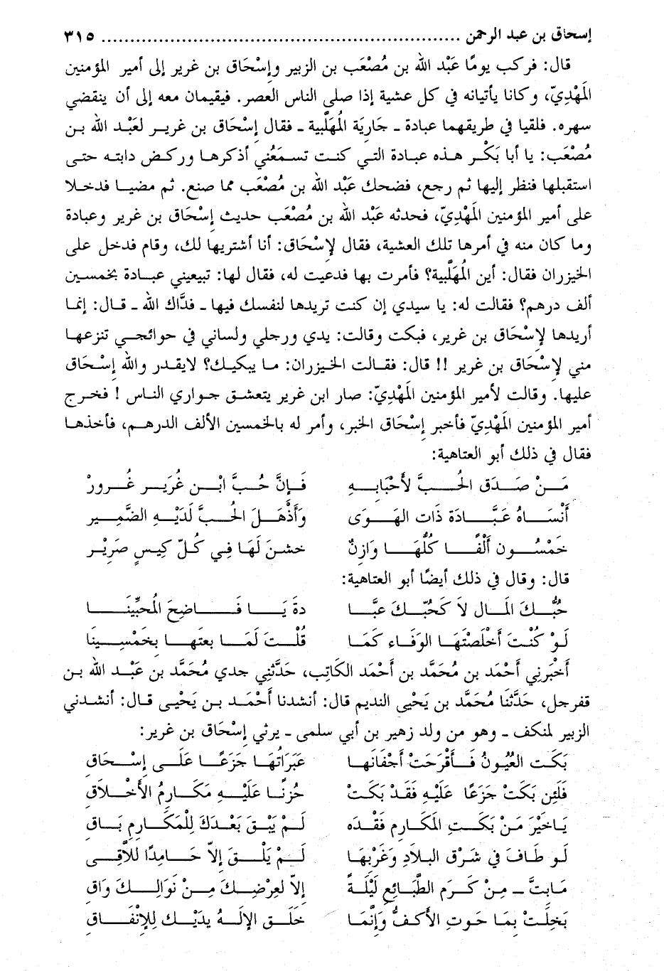 قال: فركب يوما عبد الله بن مصعب بن الزبير وإسحاق بن غرير إلى أمير المؤمنين المهدي، وكانا يأتيانه في كل عشية إذا صلى الناس العصر. فيقيمان معه إلى أن ينقضي سهره. فلقيا في طريقهما عبادة- جارية المهلبية- فقال إسحاق بن غرير لعبد الله بن مصعب: يا أبا بكر هذه عبادة التي كنت تسمعني أذكرها وركض دابته حتى استقبلها فنظر إليها ثم رجع، فضحك عبد الله بن مصعب مما صنع. ثم مضيا فدخلا على أمير المؤمنين المهدي، فحدثه عبد الله بن مصعب حديث إسحاق بن غرير وعبادة وما كان منه في أمرها تلك العشية، فقال لإسحاق: أنا أشتريها لك، وقام فدخل على الخيزران فقال: أين المهلبية؟ فأمرت بها فدعيت له، فقال لها: تبيعيني عبادة بخمسين ألف درهم؟ فقالت له: يا سيدي إن كنت تريدها لنفسك فيها- فداك الله- قال: إنما أريدها لإسحاق بن غرير، فبكت وقالت: يدي ورجلي ولساني في حوائجي تنزعها مني لإسحاق بن غرير!! قال: فقالت الخيزران: ما يبكيك؟ لا يقدر والله إسحاق عليها. وقالت لأمير المؤمنين المهدي: صار ابن غرير يتعشق جواري الناس! فخرج أمير المؤمنين المهدي فأخبر إسحاق الخبر، وأمر له بالخمسين الألف الدرهم، فأخذها فقال في ذلك أبو العتاهية: