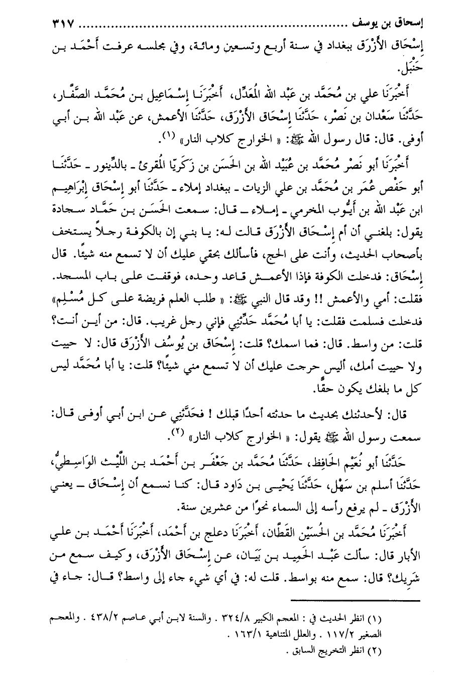 أَخْبَرَنَا عَلِيُّ بْنُ مُحَمَّدِ بْنِ عبد الله المعدّل، أخبرنا إسماعيل بن محمّد الصّفّار، حدّثنا سعدان بن نصر، حدّثنا إسحاق الأزرق، حَدَّثَنَا الأَعْمَشُ، عَنْ عَبْدِ اللَّهِ بْنِ أَبِي أَوْفَى. قَالَ: قَالَ رَسُولُ اللَّهِ صَلَّى اللَّهُ عَلَيْهِ وَسَلَّمَ: «الْخَوَارِجُ كِلابُ النَّارِ» [1]