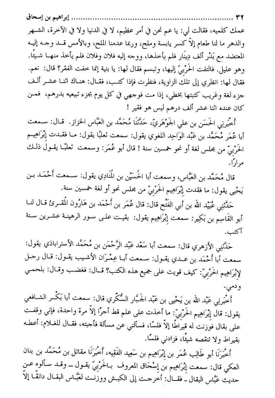 فَقَالَ لها: انظري إِلَى تلك الزاوية، فنظرت فإذا كتب، فَقَالَ: هناك اثنا عشر ألف جزء لغة وغريب كتبتها بخطي، إذا مت فوجهي فِي كل يوم بجزء تبيعيه بدرهم، فمن كَانَ عنده اثنا عشر ألف درهم ليس هو فقير! أَخْبَرَنِي الْحَسَن بْن عَلِيّ الجوهري، حَدَّثَنَا مُحَمَّد بْن الْعَبَّاس الخزاز. قَالَ: سمعت أبا عُمَر مُحَمَّد بْن عَبْد الواحد اللغوي يقول: سمعت ثعلبا يقول: ما فقدت إِبْرَاهِيم الحربي من مجلس لغة أو نحو خمسين سنة! قَالَ أَبُو عُمَر: وسمعت ثعلبا يقول ذلك مرارا.