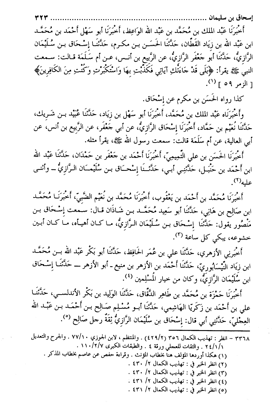 أخبرنا حمزة بن محمد بن طاهر الدقاق، حدّثنا الوليد بن بكر الأندلسي، حدثنا علي بن أحمد بن زكريا الهاشمي، حدثنا أبو مسلم صالح بن أحمد بن عبد الله العجليّ، حدثني أبي قال: إسحاق بن سليمان الرازي ثقة رجل صالح [5] .