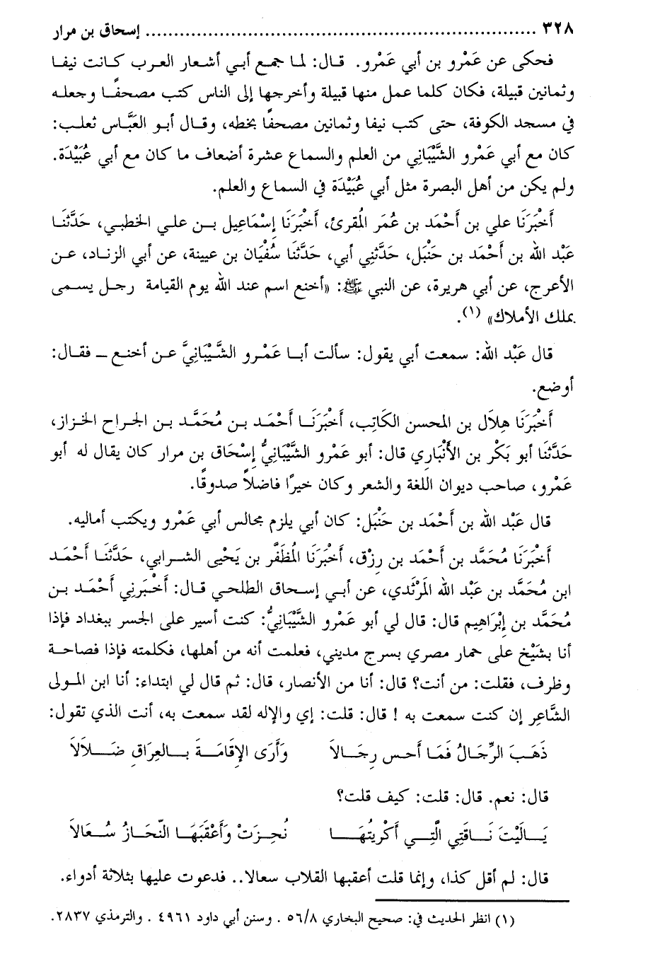 أخبرنا هلال بن المحسن الكاتب، أَخْبَرَنَا أَحْمَد بْن مُحَمَّد بْن الجراح الخزاز، حدّثنا أبو بكر بن الأنباري قال: أبو عمرو الشيباني إسحاق بن مرار كان يقال له أبو عمرو، صاحب ديوان اللغة والشعر وكان خيرا فاضلا صدوقا.