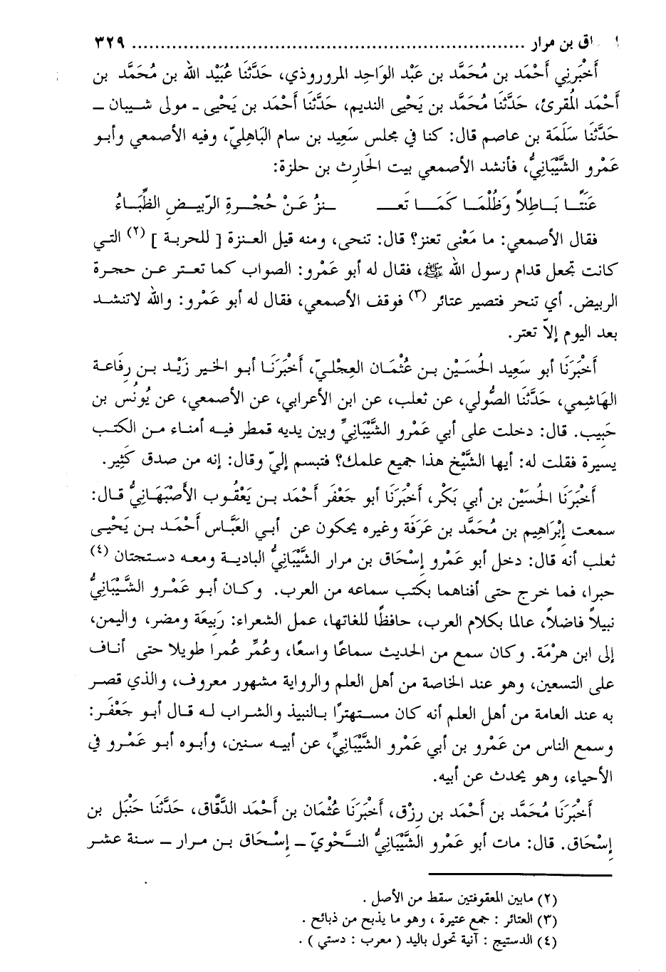 سمعت إِبْرَاهِيم بْن مُحَمَّد بْن عرفة وغيره يحكون عن أَبِي العباس أَحْمَد بْن يحيى ثعلب أنه قال: دخل أبو عمرو إسحاق بن مرار الشّيبانيّ البادية ومعه دستجتان [3] حبرا، فما خرج حتى أفناهما بكتب سماعه من العرب. وكان أبو عمرو الشيباني نبيلا فاضلا، عالما بكلام العرب، حافظا للغاتها، عمل الشعراء: ربيعة ومضر، واليمن، إلى ابن هرمة. وكان سمع من الحديث سماعا واسعا، وعمر عمرا طويلا حتى أناف على التسعين، وهو عند الخاصة من أهل العلم والرواية مشهور معروف، والذي قصر به عند العامة من أهل العلم أنه كان مستهترا بالنبيذ والشراب له قال أبو جعفر: