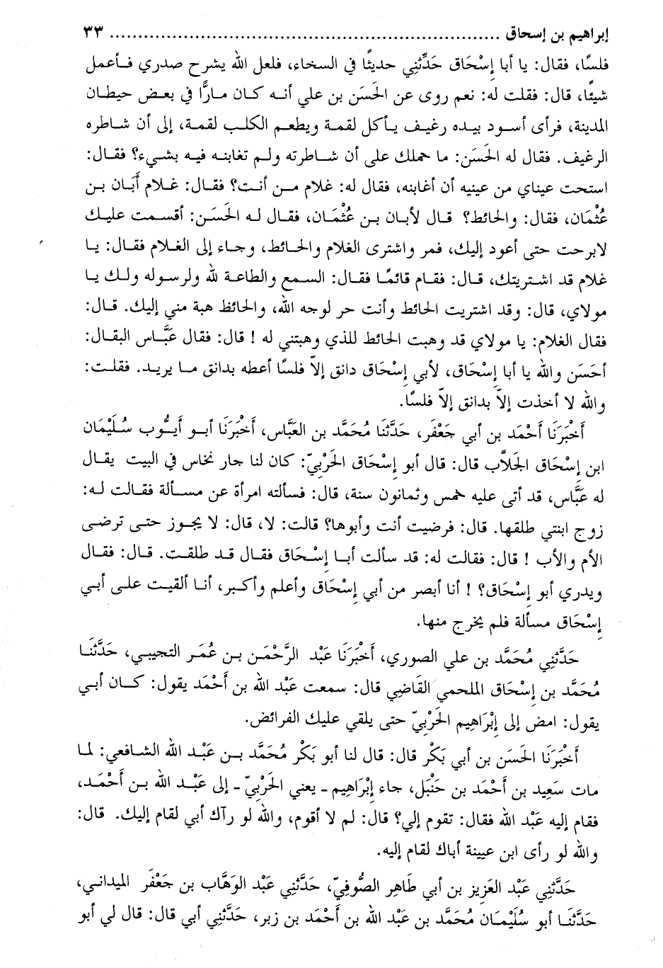 حَدَّثَنِي مُحَمَّد بْن عَلِيّ الصوري، أخبرنا عبد الرّحمن بن عمر التجيبي، حَدَّثَنَا مُحَمَّد بْن إِسْحَاق الملحمي الْقَاضِي قَالَ: سمعت عَبْد اللَّهِ بْن أَحْمَد يقول: كَانَ أَبِي يقول: امض إِلَى إِبْرَاهِيم الحربي حتى يلقى عليك الفرائض.