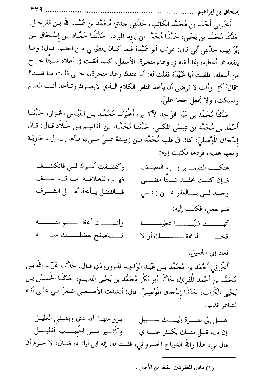 أَخْبَرَنِي أَحْمَد بن مُحَمَّد بن عبد الواحد المروروذي قال: حدثنا عبيد الله بن محمد بن أحمد المقرئ، حدثنا أبو بكر محمد بن يحيى النديم، حدّثنا الحسين بن يحيى الكاتب، حدثنا إسحاق الموصلي. قال: أنشدت الأصمعي شعرا لي على أنه لشاعر قديم: