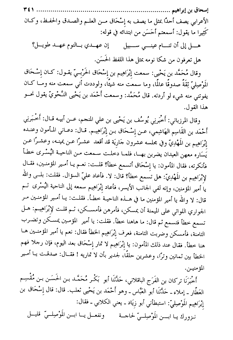 أخبرنا تركان بن الفرج الباقلاني، حَدَّثَنَا أَبُو بَكْرٍ مُحَمَّدُ بْنُ الْحَسَنِ بْنِ مُقْسِمٍ العطار- إملاء- حدثنا أبو العباس- وهو أحمد بن يحيى ثعلب. قال: قال إسحاق بن إبراهيم الموصلي: استبطأني أبو زياد- يعنى الكلابي- فقال: