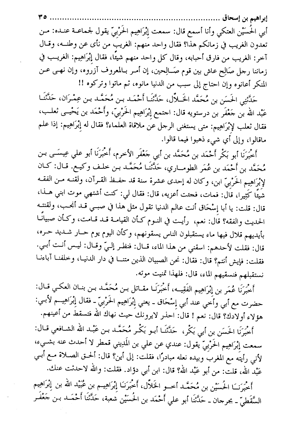أَبِي الحسين العتكي وأَنَا أسمع قَالَ: سمعت إِبْرَاهِيم الحربي يقول لجماعة عنده: من تعدون الغريب فِي زمانكم هذا؟ فَقَالَ واحد منهم: الغريب من نأى عَن وطنه، وَقَالَ آخر: الغريب من فارق أحبابه، وَقَالَ كل واحد منهم شيئا، فَقَالَ إِبْرَاهِيم: الغريب فِي زماننا رَجُل صَالِح عاش بين قوم صَالِحين، إن أمر بالمعروف آزروه، وإن نهى عَنِ المنكر أعانوه وإن احتاج إِلَى سبب من الدُّنْيَا مانوه، ثم ماتوا وتركوه!! حَدَّثَنِي الحسن بن محمّد الخلّال، حدّثنا أحمد بن محمّد بن عمران، حَدَّثَنَا عبد اللَّه بْن جعفر بْن درستويه قَالَ: اجتمع إِبْرَاهِيم الحربي، وأَحْمَد بْن يَحْيَى ثعلب، فَقَالَ ثعلب لإبراهيم: متى يستغنى الرجل عَن ملاقاة العلماء؟ فَقَالَ له إِبْرَاهِيم: إذا علم ما قالوا، وَإِلَى أي شيء ذهبوا فِيما قالوا.