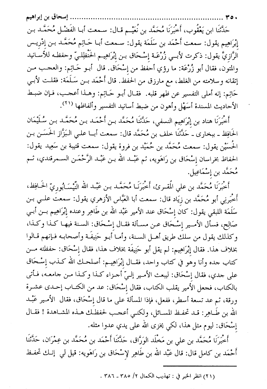 أَخْبَرَنَا مُحَمَّد بْن عَلِيّ بْن مَخْلَدٍ الْوَرَّاقُ، حدّثنا أحمد بن محمّد بن عمران، حدثنا أحمد بن كامل قال: قال عبد الله بن طاهر لإسحاق بن راهويه: قيل لي إنك تحفظ