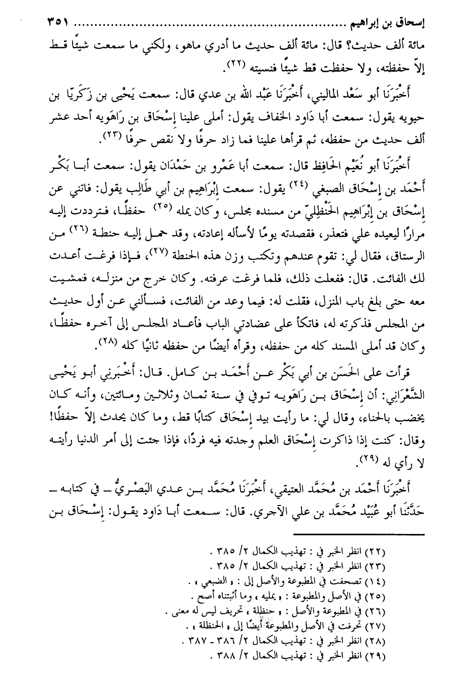 أخبرنا أَبُو سعد الماليني، أَخْبَرَنَا عَبْد اللَّه بْن عدي قَالَ: سمعتُ يحيى بن زكريا بن حيويه يقول: سمعت أبا داود الخفاف يقول: أملى علينا إسحاق بن راهويه أحد عشر ألف حديث من حفظه، ثم قرأها علينا فما زاد حرفا ولا نقص حرفا [2] .