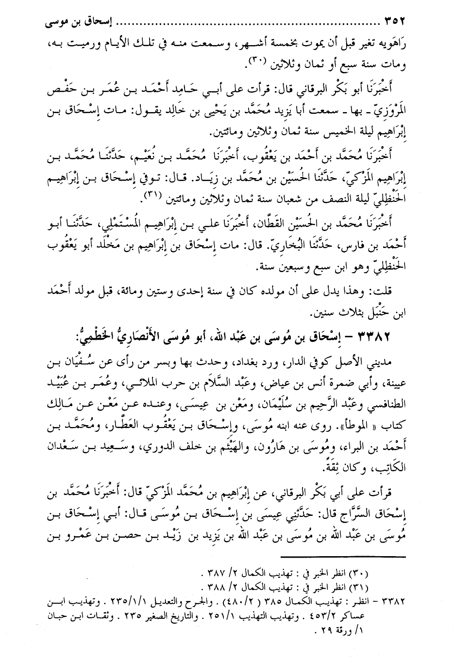قرأت عَلَى أَبِي بكر البرقاني، عَنْ إِبْرَاهِيم بْن مُحَمَّد المُزَكي قَالَ: أَخْبَرَنَا مُحَمَّد بْن إسحاق السراج قال: حدثني عيسى بن إسحاق بن موسى قال: أبي إسحاق بن موسى بن عَبْدُ اللَّهِ بْنُ مُوسَى بْنِ عَبْدِ اللَّهِ بن يزيد بن زيد بن حصن بن عمرو بن