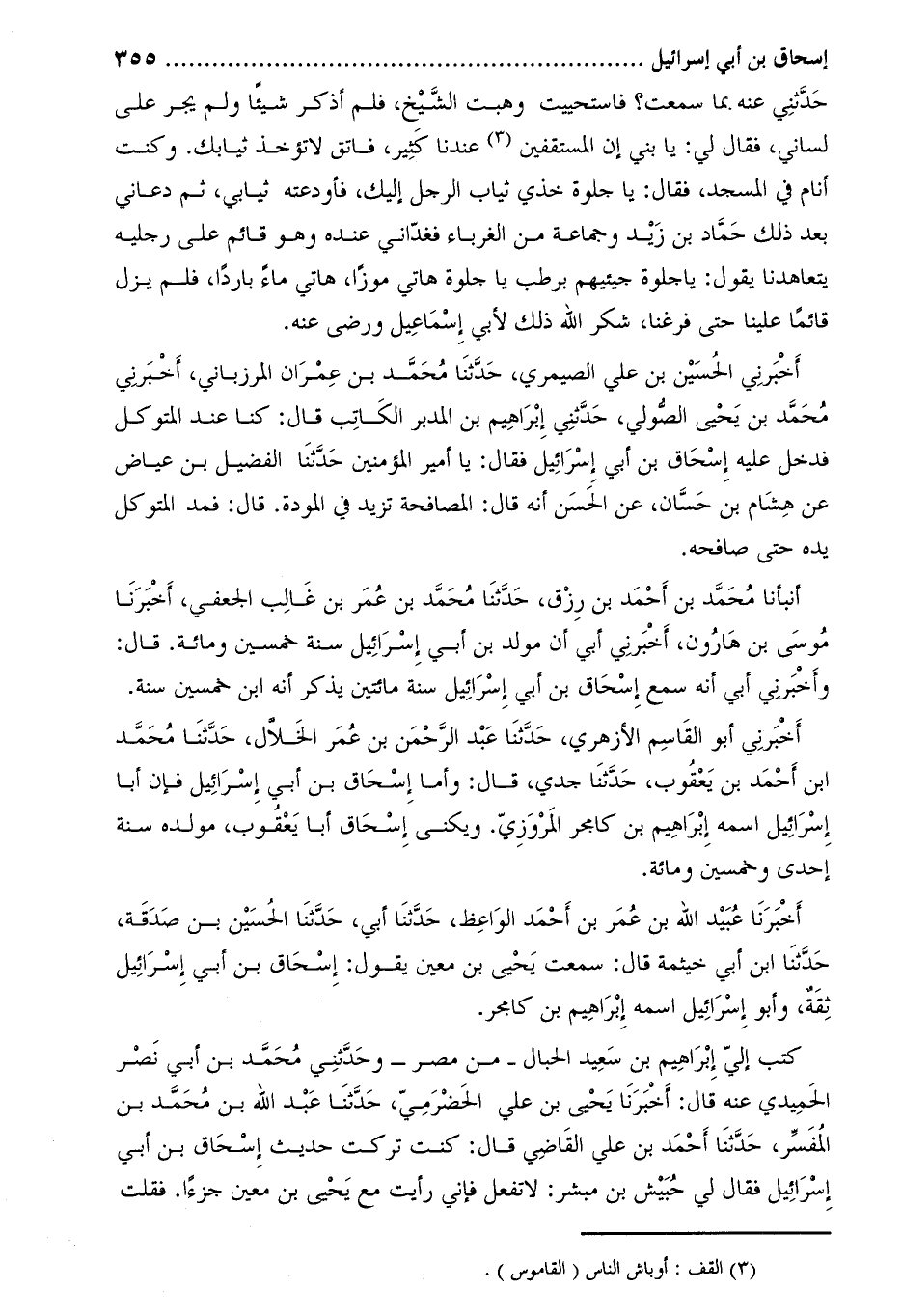 أخبرني أبو القاسم الأزهري، حدّثنا عَبْد الرَّحْمَن بْن عُمَر الخلال، حَدَّثَنَا مُحَمَّد ابن أحمد بن يعقوب، حدثنا جدي، قال: وأما إسحاق بن أبي إسرائيل فإن أبا إسرائيل اسمه إبراهيم بن كامجر المروزي. ويكنى إسحاق أبا يعقوب، مولده سنة إحدى وخمسين ومائة.