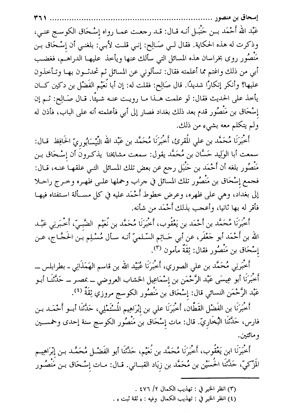 أخبرني محمد بن علي الصوري، أخبرنا عبيد الله بن قاسم الهمذاني- بطرابلس- أَخْبَرَنَا أَبُو عيسى عَبْد الرَّحْمَن بْن إِسْمَاعِيل الخشاب العروضي- بمصر- حدثنا أبو عبد الرحمن النسائي قال: إسحاق بن منصور الكوسج مروزي ثقة [2] .