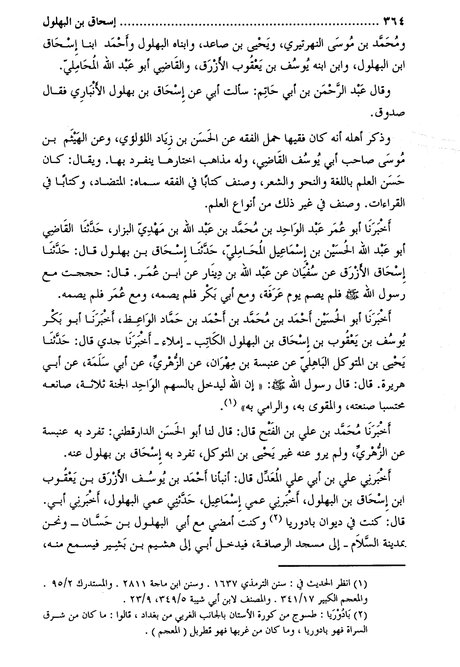 أَخْبَرَنَا أَبُو الْحُسَيْنِ أَحْمَدُ بْنُ مُحَمَّدِ بْنِ أحمد بن حماد الواعظ، أخبرنا أَبُو بَكْرٍ يُوسُفُ بْنُ يَعْقُوبَ بْنِ إِسْحَاقَ بن البهلول الكاتب- إملاء- أَخْبَرَنَا جَدِّي قَالَ: حَدَّثَنَا يَحْيَى بْنُ الْمُتَوَكِّلِ الْبَاهِلِيُّ عَنْ عَنْبَسَةَ بْنِ مِهْرَانَ، عَنِ الزُّهْرِيِّ، عَنْ أَبِي سَلَمَةَ، عَنْ أَبِي هُرَيْرَةَ. قَالَ: قَالَ رَسُولُ اللَّهِ صَلَّى اللَّهُ عَلَيْهِ وَسَلَّمَ: «إِنَّ اللَّهَ لَيُدْخِلَ بِالسَّهْمِ الْوَاحِدِ الْجَنَّةَ ثَلاثَةً، صَانِعَهُ مُحْتَسِبًا صَنْعَتَهُ، وَالْمُقَوِّي بِهِ، وَالرَّامِي بِهِ» [1]