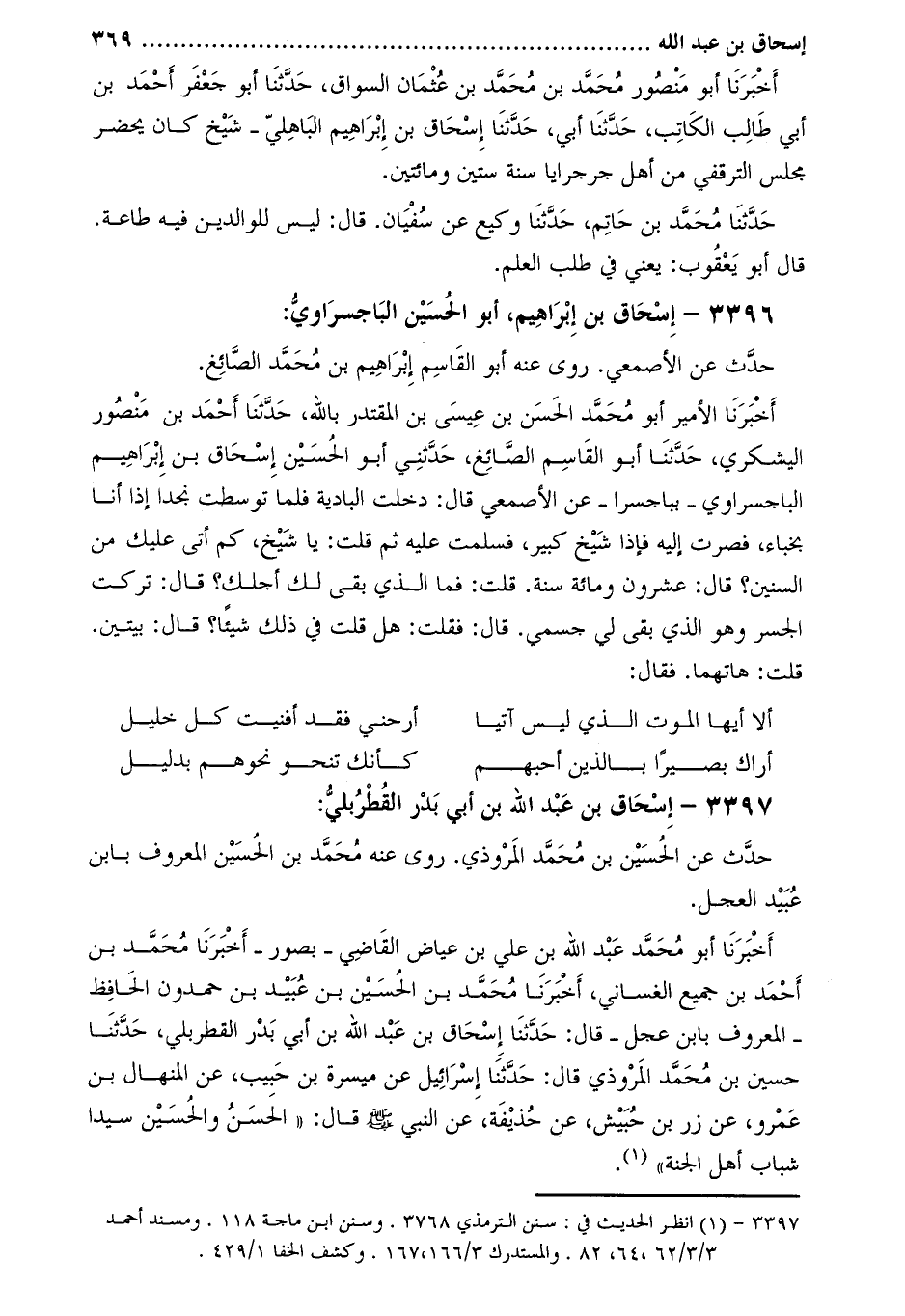 أَخْبَرَنَا أَبُو مُحَمَّد عَبْد اللَّهِ بْن عَلِيّ بْنِ عياض القاضي- بصور- أَخْبَرَنَا مُحَمَّدُ بْنُ أَحْمَدَ بْنِ جُمَيْعٍ الْغَسَّانِيُّ، أَخْبَرَنَا مُحَمَّدُ بْنُ الْحُسَيْنِ بْنِ عُبَيْدِ بْنِ حَمْدُونَ الْحَافِظُ- الْمَعْرُوفُ بِابْنِ عِجْلٍ- قَالَ: حَدَّثَنَا إسحاق بن عبد الله بن أبي بدر القطربلي، حَدَّثَنَا حُسَيْنُ بْنُ مُحَمَّدٍ الْمَرُّوذِيُّ قَالَ: حَدَّثَنَا إِسْرَائِيلُ عَنْ مَيْسَرَةَ بْنِ حَبِيبٍ، عَنِ الْمِنْهَالِ بْنِ عَمْرٍو، عَنْ زِرِّ بْنِ حُبَيْشٍ، عَنْ حُذَيْفَةَ، عَنِ النَّبِيِّ صَلَّى اللَّهُ عَلَيْهِ وَسَلَّمَ قَالَ: «الْحَسَنُ وَالْحُسَيْنُ سَيِّدَا شَبَابِ أَهْلِ الْجَنَّةِ» [1] .