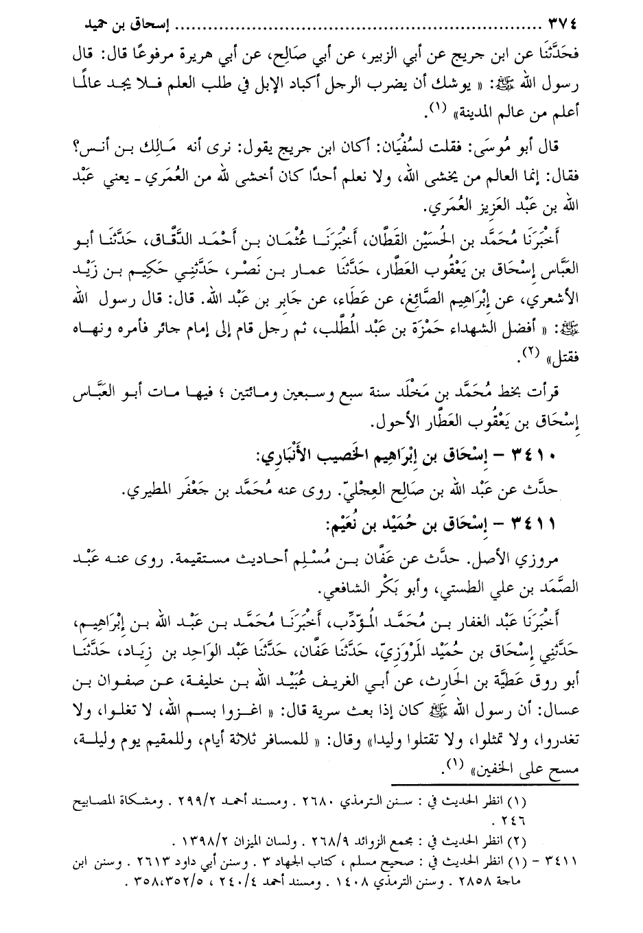 أَخْبَرَنَا عَبْدُ الْغَفَّارِ بْنُ مُحَمَّدٍ المؤدّب، أخبرنا محمد بن عبد الله بن إبراهيم، حدّثني إسحاق بن حميد المروزيّ، حدّثنا عفّان، حدّثنا عبد الواحد بن زياد، حَدَّثَنَا أَبُو رَوْقٍ عَطِيَّةُ بْنُ الْحَارِثِ، عَنْ أَبِي الْغَرِيفِ عُبَيْدِ اللَّهِ بْنِ خَلِيفَةَ، عَنْ صَفْوَانَ بْنِ عَسَّالٍ: أَنَّ رَسُولَ اللَّهِ صَلَّى اللَّهُ عَلَيْهِ وَسَلَّمَ كَانَ إِذَا بَعَثَ سَرِيَّةً قَالَ: «اغْزُوا بِسْمِ اللَّهِ، لا تَغلُّوا، وَلا تَغْدُرُوا، وَلا تُمَثِّلُوا، وَلا تَقْتُلُوا وَلِيدًا» وَقَالَ: «لِلْمُسَافِرِ ثَلاثَةُ أَيَّامٍ، وَلِلْمُقِيمِ يَوْمٌ وَلَيْلَةٌ، مَسْحٌ على الخفين» [3] .