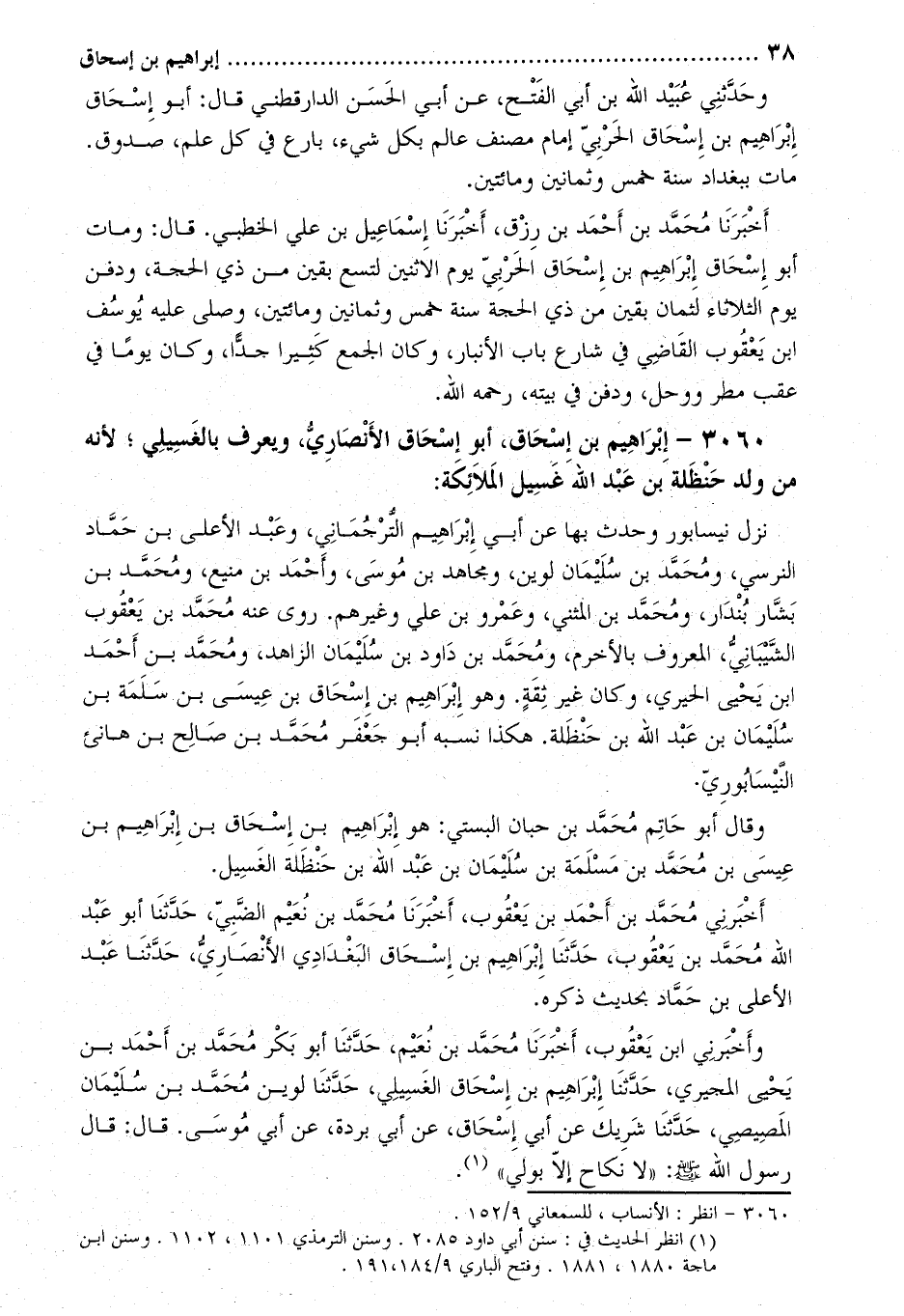 3060- إِبْرَاهِيم بْن إِسْحَاق، أَبُو إِسْحَاق الأنصاري، ويعرف بالغسيلي؛ لأنه من ولد حنظلة بْن عَبْد اللَّهِ غسيل الملائكة [1] :