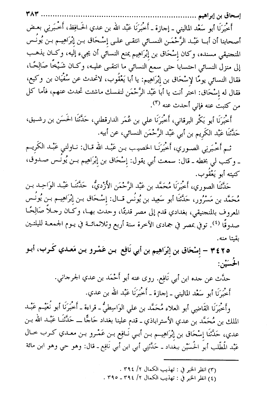 3425- إسحاق بن إبراهيم بن أبي نافع بن عمرو بن معدي كرب، أبو الحسين: