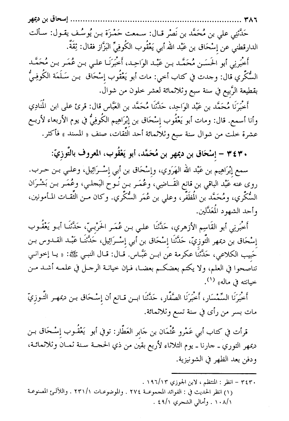 3430- إسحاق بن ديمهر بن محمد، أبو يعقوب، المعروف بالتوزي: