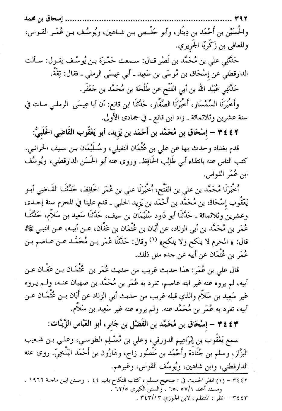 أَخْبَرَنَا مُحَمَّدُ بْنُ عَلِيِّ بْنِ الْفَتْحِ، أَخْبَرَنَا عَلِيُّ بن عمر الحافظ، حَدَّثَنَا الْقَاضِي أَبُو يَعْقُوبَ إِسْحَاقُ بْنُ مُحَمَّدِ بْنِ أَحْمَدَ بْنِ يَزِيدَ الْحَلَبِيُّ- قَدِمَ عَلَيْنَا في المحرم سنة إحدى وعشرين وثلاثمائة- حَدَّثَنَا أَبُو دَاوُدَ سُلَيْمَانُ بْنُ سَيْفٍ، حَدَّثَنَا سعيد بن سلّام، حدّثنا عمر بن محمّد بن أَبِي الزِّنَادِ، عَنْ أَبَانَ بْنِ عُثْمَانَ بْنِ عَفَّانَ، عَنْ أَبِيهِ، عَنِ النَّبِيِّ صَلَّى اللَّهُ عَلَيْهِ وَسَلَّمَ قَالَ: «الْمُحْرِمُ لا يَنْكِحُ وَلا يُنْكَحُ» [1] وقال: حدثنا عمر بن محمد عن عاصم بن عمر بن عثمان عن أبيه عن جده مثل ذلك.