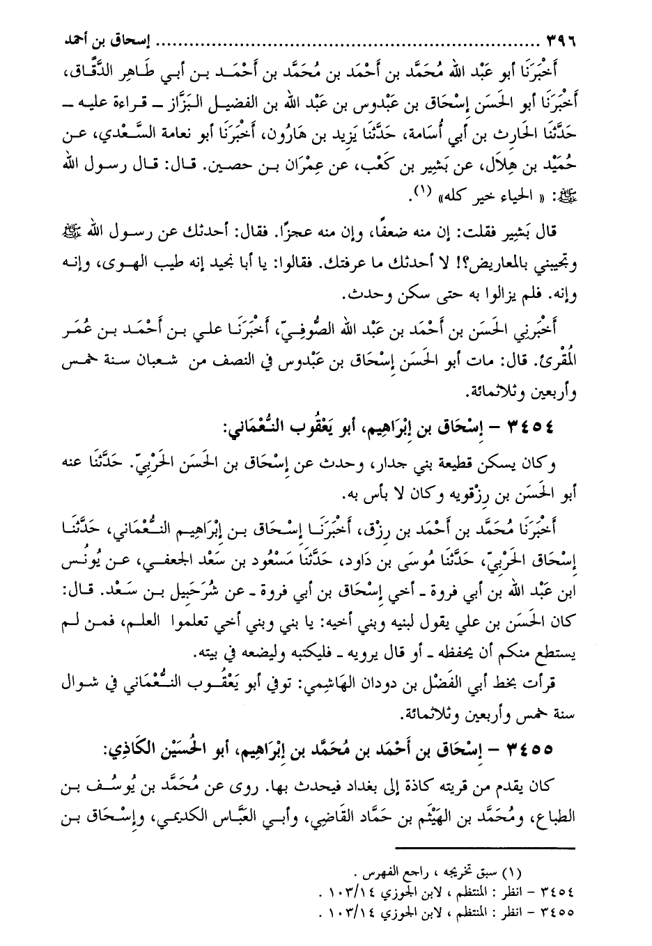 أَخْبَرَنَا أَبُو عَبْدِ اللَّهِ مُحَمَّدُ بْنُ أَحْمَدَ بْنِ مُحَمَّدِ بْنِ أَحْمَدَ بْنِ أَبِي طَاهِرٍ الدقاق، أَخْبَرَنَا أَبُو الْحَسَنِ إِسْحَاقُ بْنُ عَبْدُوسِ بْنِ عَبْدِ اللَّهِ بْنِ الْفُضَيْلِ الْبَزَّازُ- قِرَاءَةً عَلَيْهِ- حدّثنا الحارث بن أبي أسامة، حدّثنا يزيد بن هارون، أَخْبَرَنَا أَبُو نَعَامَةَ السَّعْدِيُّ، عَنْ حُمَيْدِ بْنِ هِلالٍ، عَنْ بَشِيرِ بْنِ كَعْبٍ، عَنْ عِمْرَانَ بْنِ حُصَيْنٍ. قَالَ: قَالَ رَسُولُ اللَّهِ صَلَّى اللَّهُ عَلَيْهِ وَسَلَّمَ: «الْحَيَاءُ خَيْرٌ كُلُّهُ» [1] .